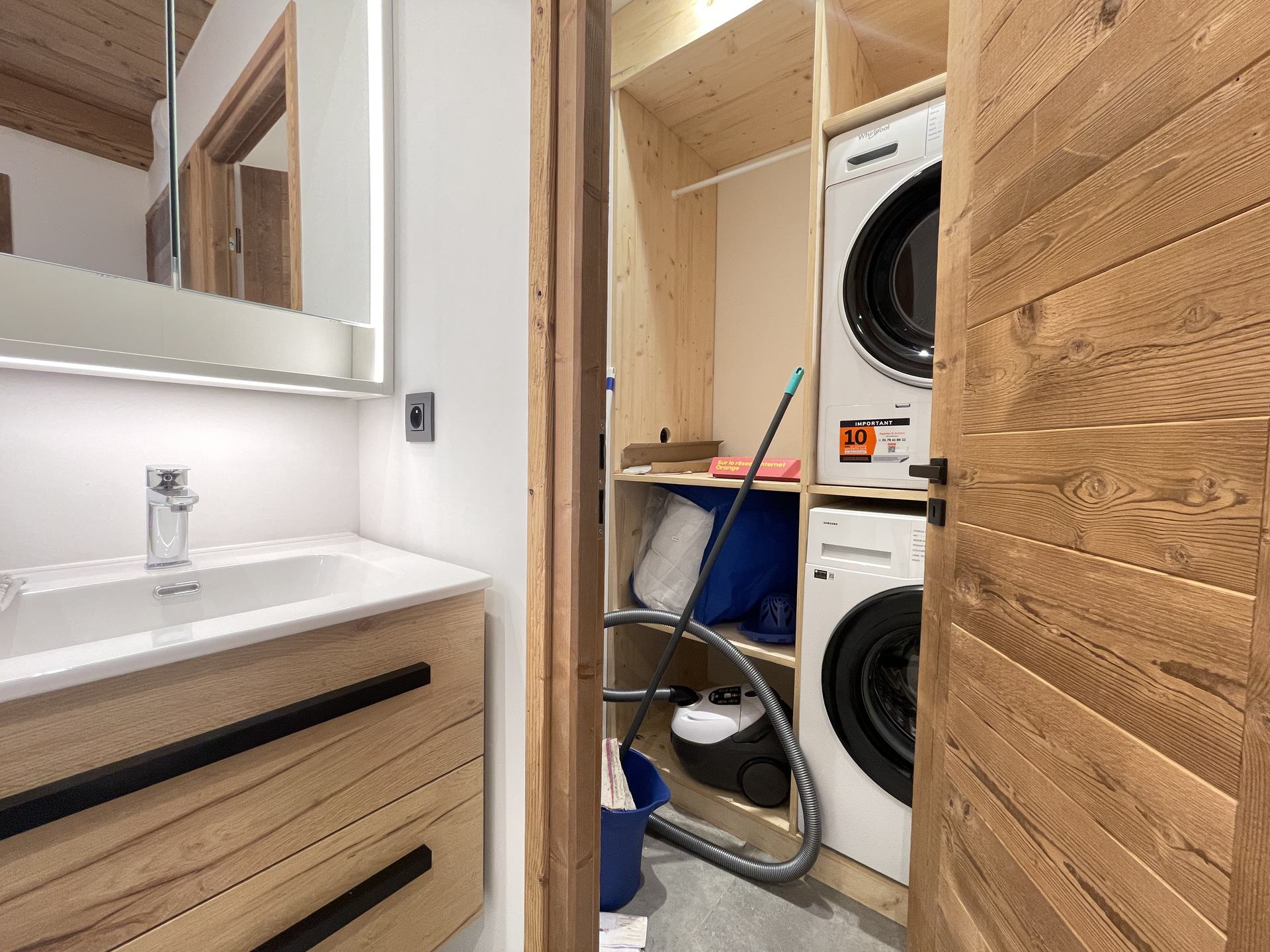 - Une salle de bains avec baignoire, douche, double vasque et acces a un toilettes independant, et buanderie avec lave-linge et seche-linge.