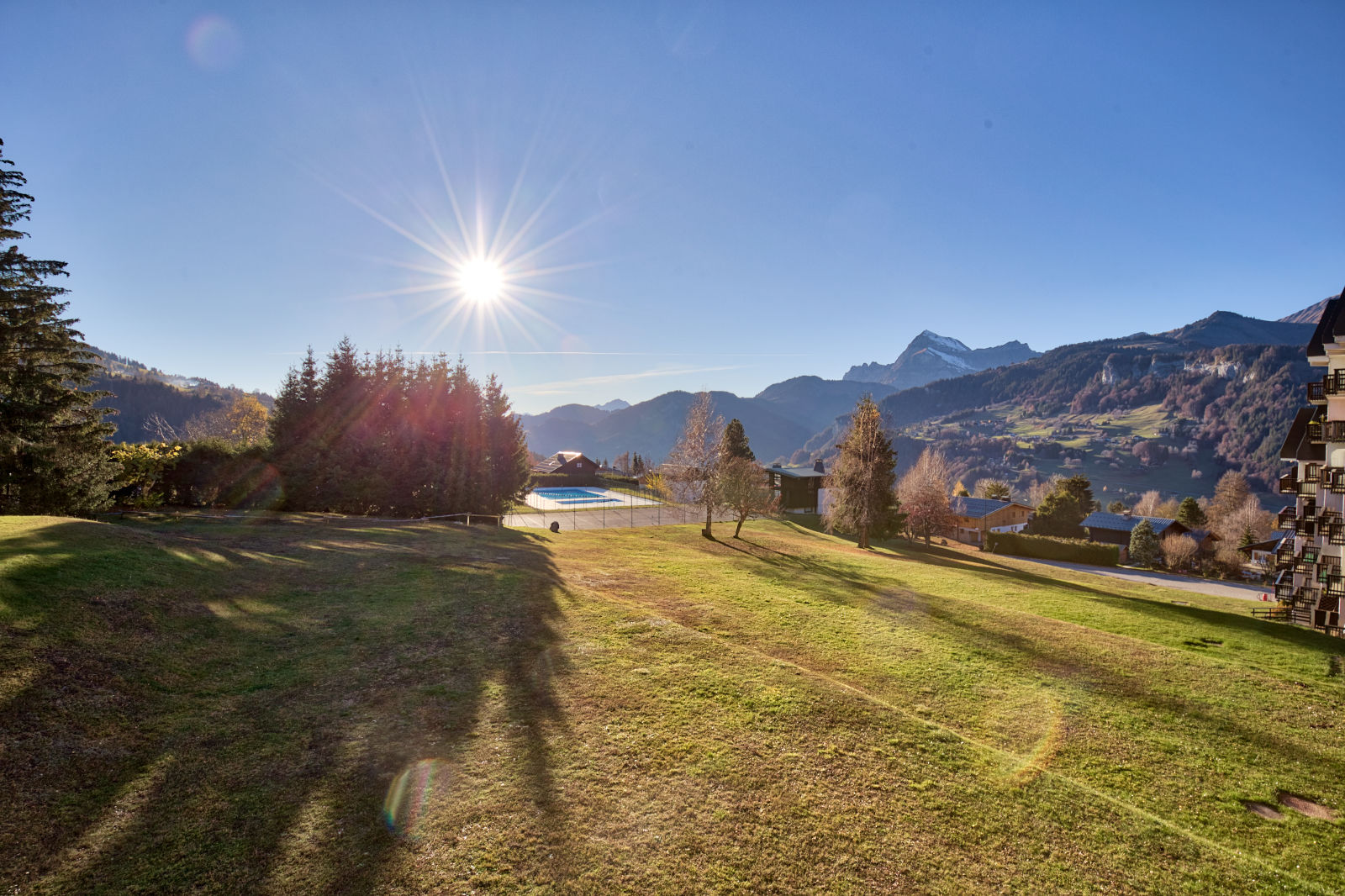 Idéal pour 3 à 4 voyageurs, studio cosy de 27 m² au deuxième étage avec un balcon SUD et une vue dégagée sur le village, le Mont Charvin et la vallée.