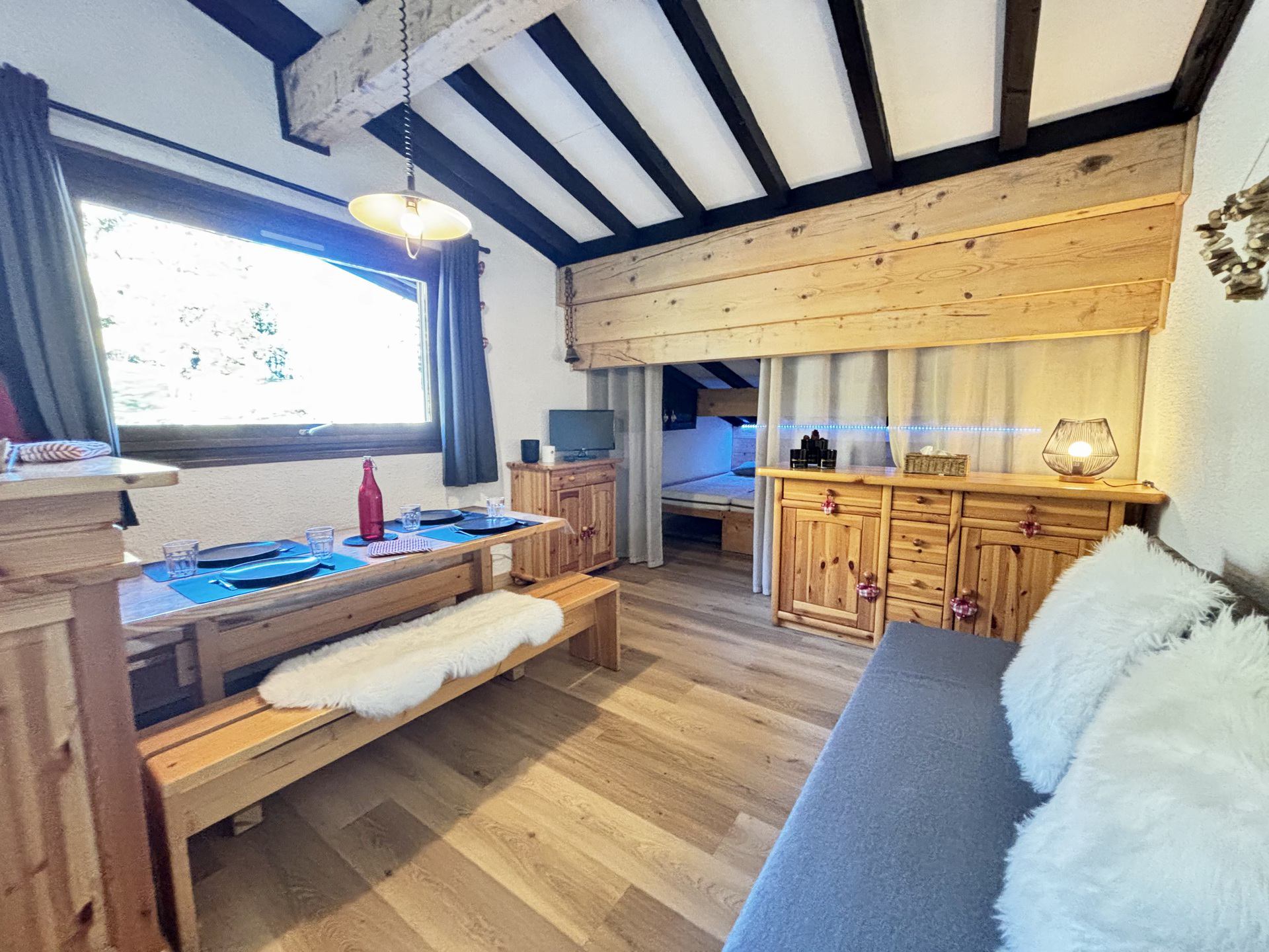 NOTRE AVIS : Ce studio bien agence et tres fonctionnel, offre un espace optimise ideal pour un couple ou une petite famille. Situe dans un environnement calme, au pied des pistes, il permet un acces skis a quelques metres de l''Espace Diamant.