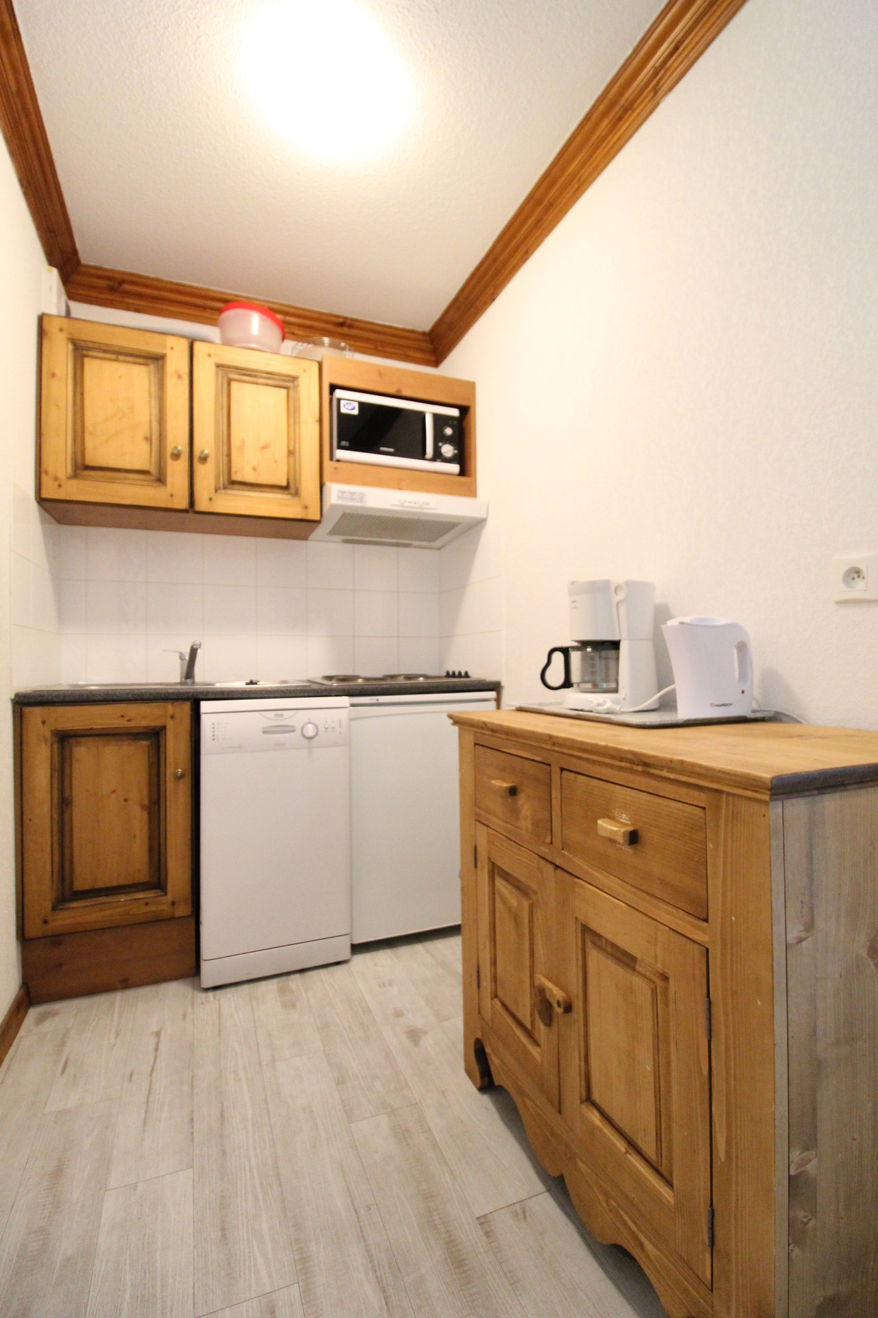 Sejour avec kitchenette equipee : micro-onde/grill, refrigerateur, 4 plaques electriques, lave vaisselle, hotte aspirante.