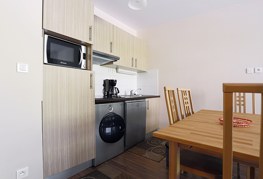 Kitchenette equipee de 4 plaques vitroceramiques, d'un combine four/micro ondes, d'un refrigerateur, d'un lave vaisselle et d'un lave linge.
