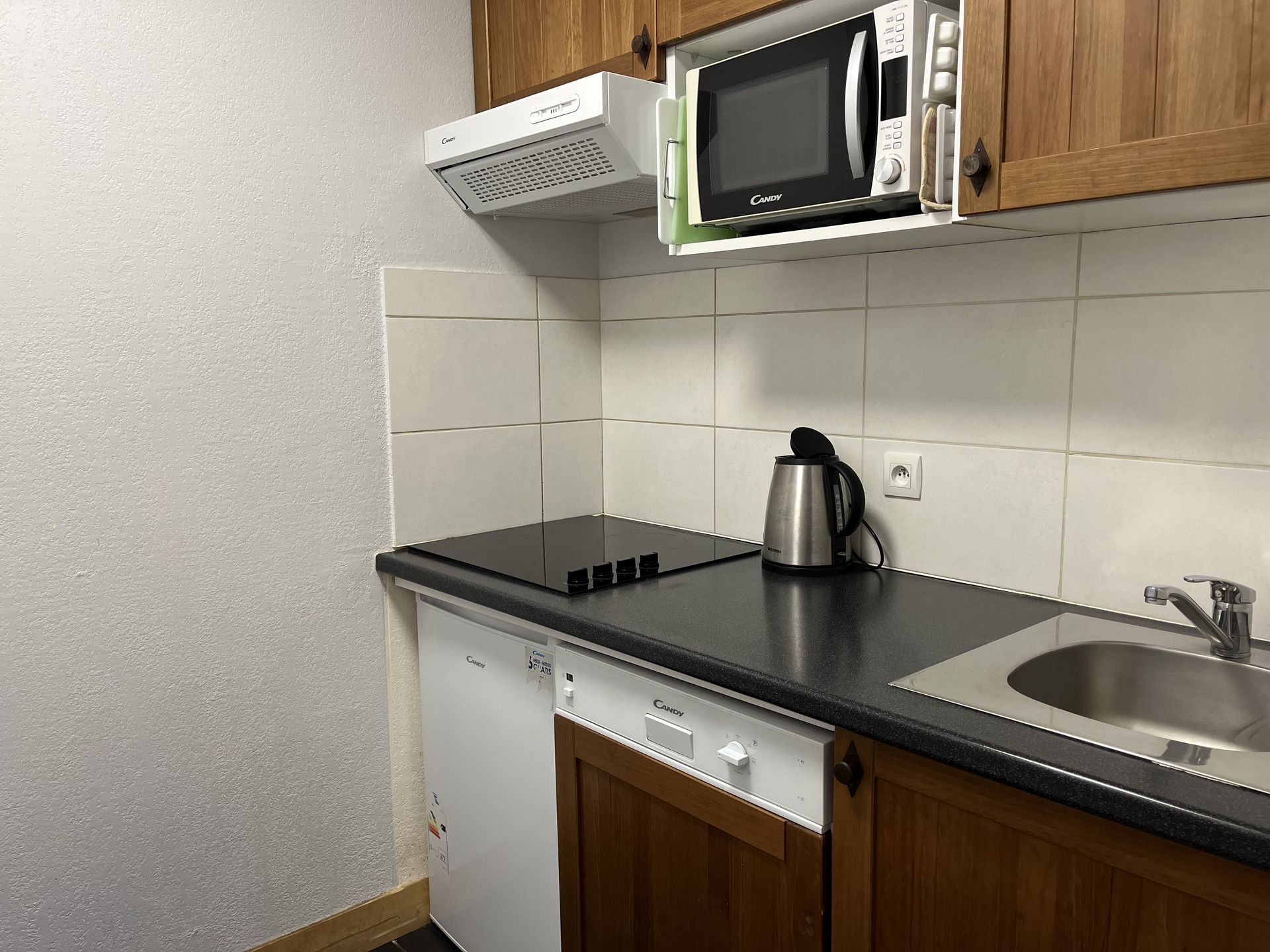 Coin cuisine equipee d'une plaque vitroceramique, micro-ondes, lave-vaisselle et refrigerateur.