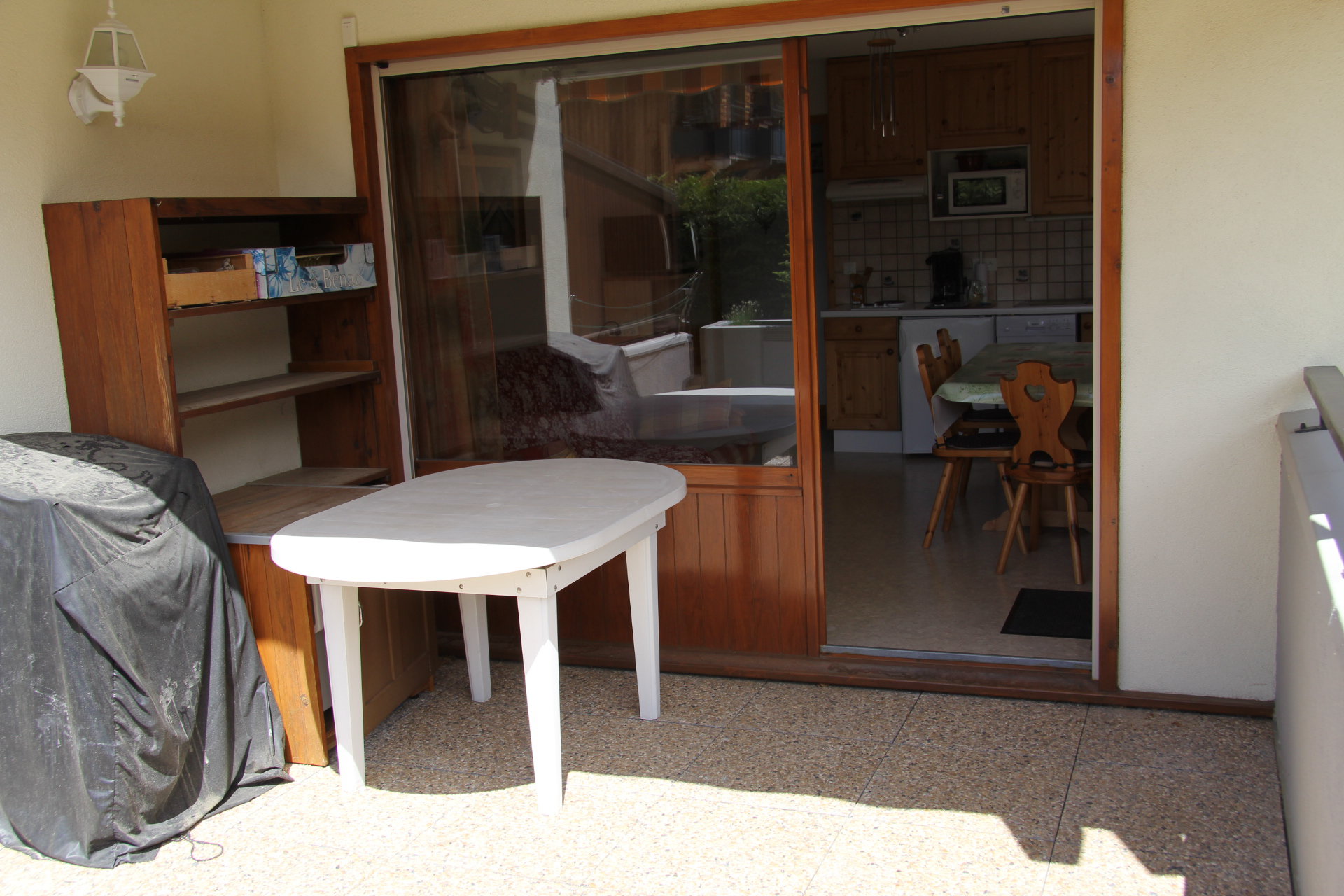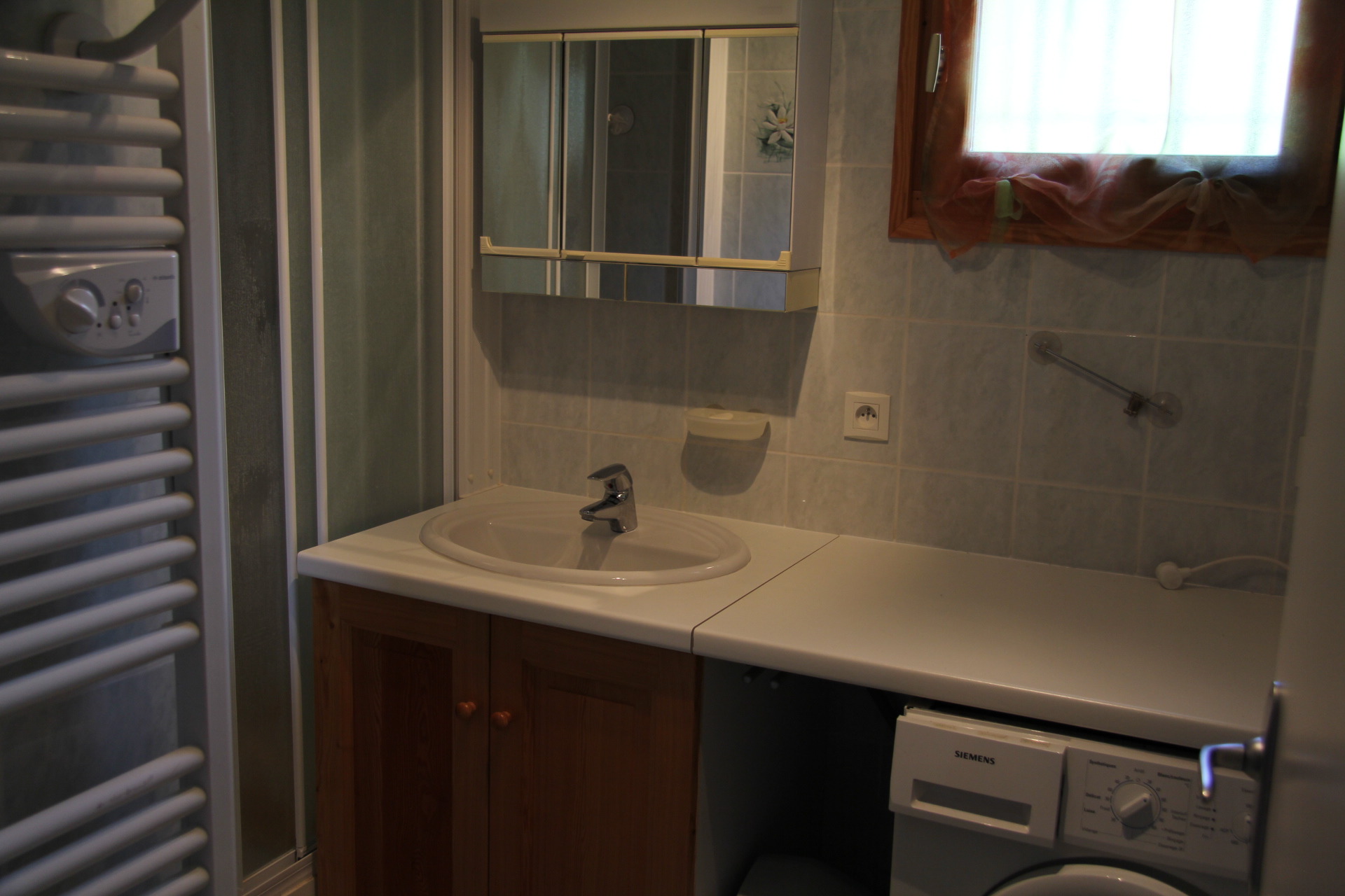 Entree/Hall - Coin nuit en couloir (6.33m2) avec lits - WC independants (1.37m2) - SdBains (3.12m2): Douche, lavabo, lave-linge, seche-serviette - WC (1.90m2) - Chambre (10m2): lit, penderie, TV, fenetre sud-est - Sejour (15m2) : Coin cuisine equipee : Plaque 2 feux, refrigerateur, four, lave-vaisselle, micro-ondes - Coin salon avec canape, TV - Coin repas avec table et chaises, baie vitree acces terrasse (table + chaises de jardin).