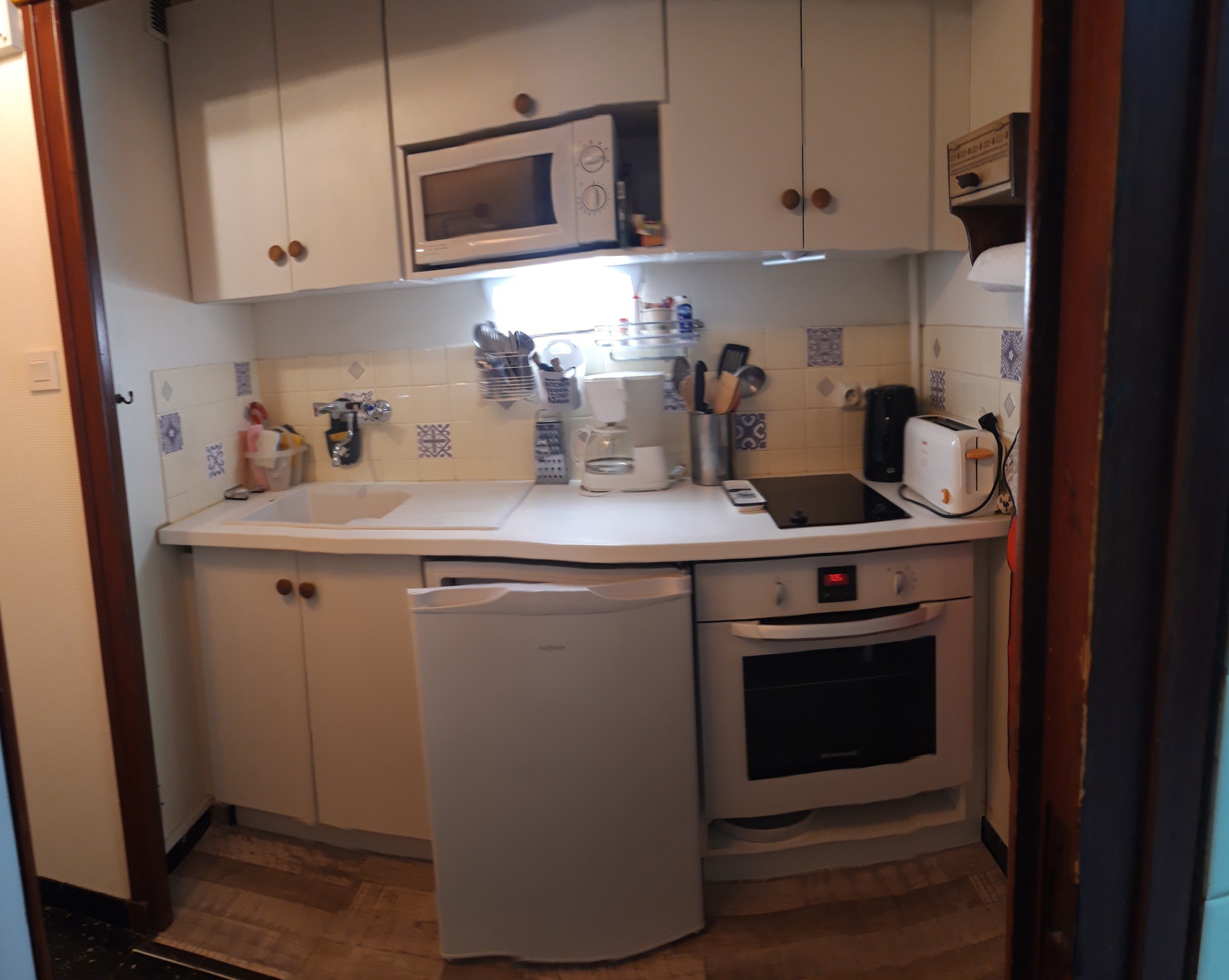 Cuisine : four, micro-ondes, refrigerateur, plaque vitroceramique (2 foyers).