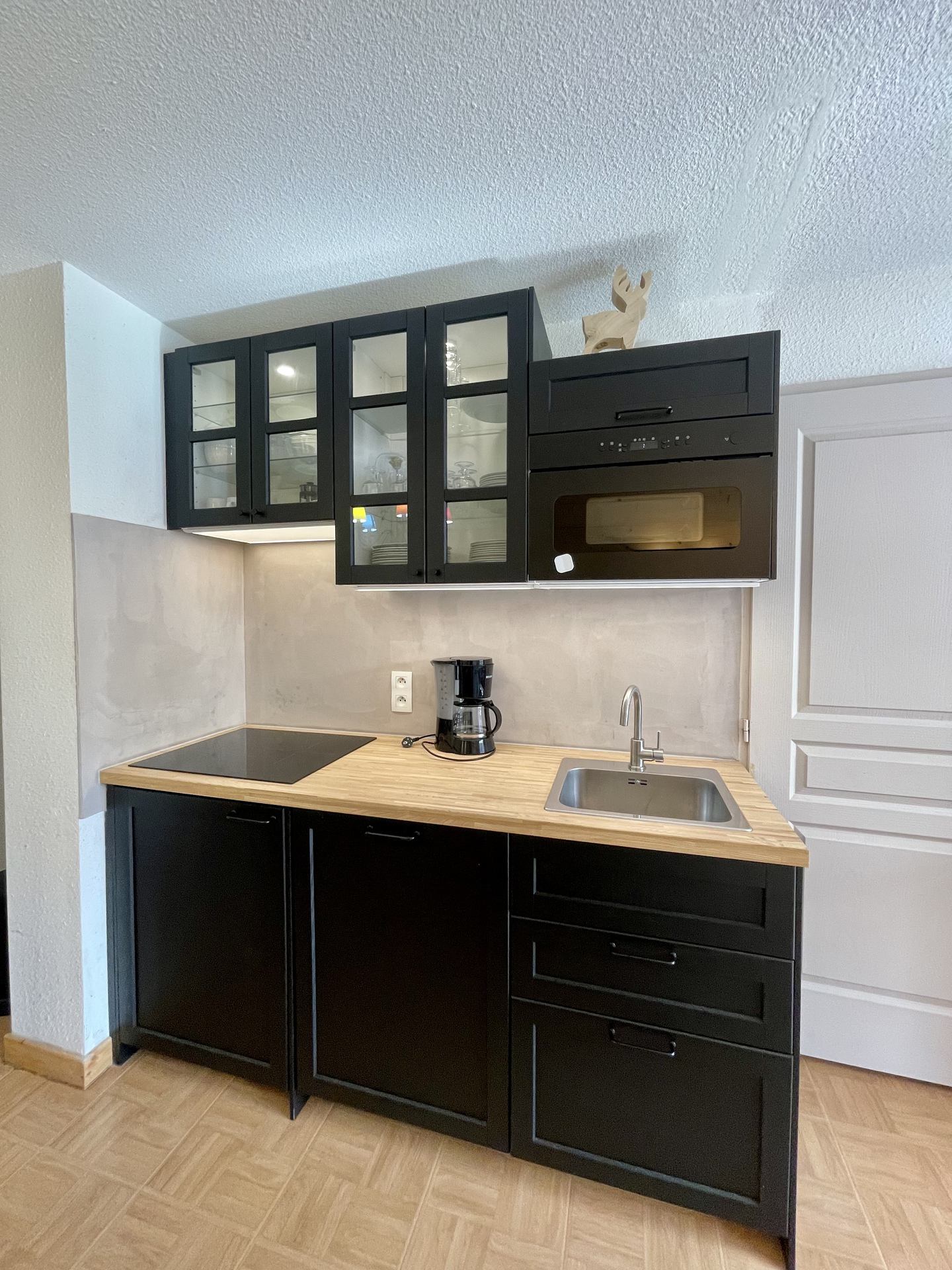 -CUISINE ouverte : plaque de cuisson à induction triple foyer, micro-ondes, réfrigérateur-congélateur, lave-vaisselle.