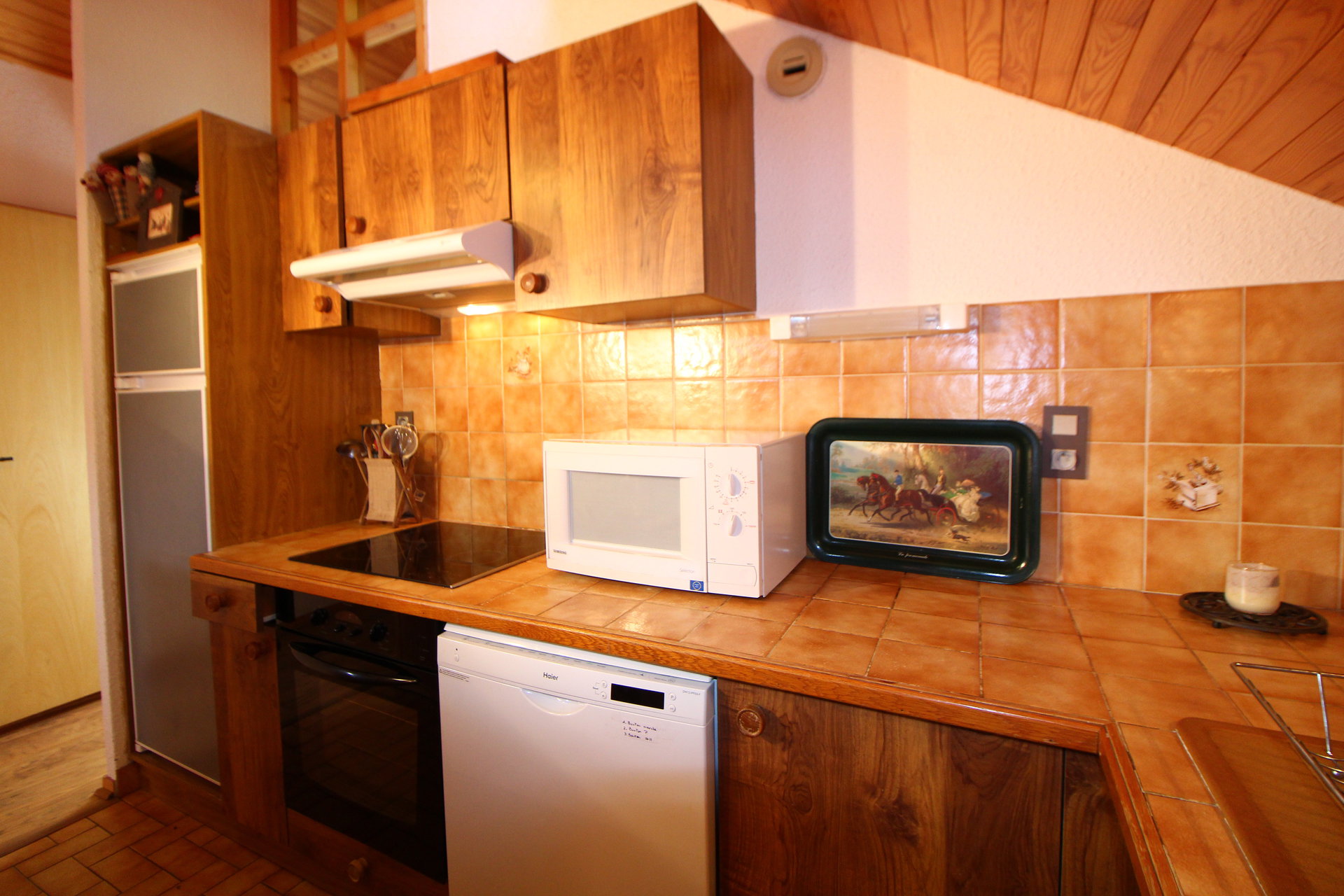 - 1 Kitchenette equipee de plaques electriques, four, micro-ondes, lave-vaisselle, frigo et petit congelateur, lave-linge, cafetiere electrique, grille-pain, bouilloire et toute la vaisselle necessaire.