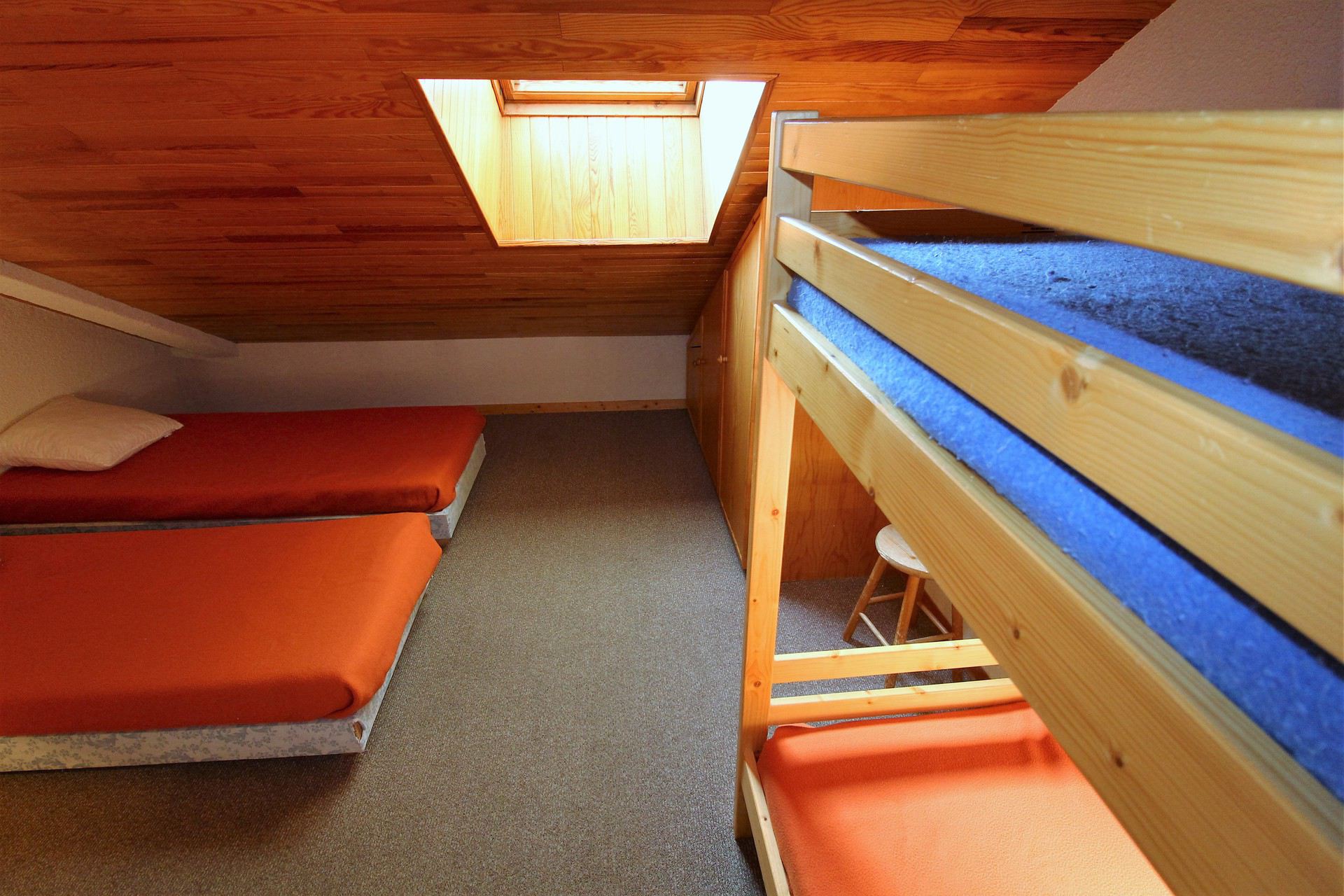 - 1 chambre avec velux en partie en sous pente avec 2 lits 1 personne et 2 lits superposes (80x190) et couettes
