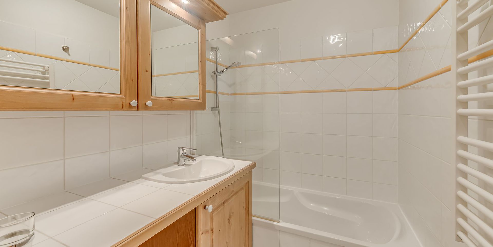 - 1 salle de bains avec baignoire, meuble vasque et radiateur seche serviettes