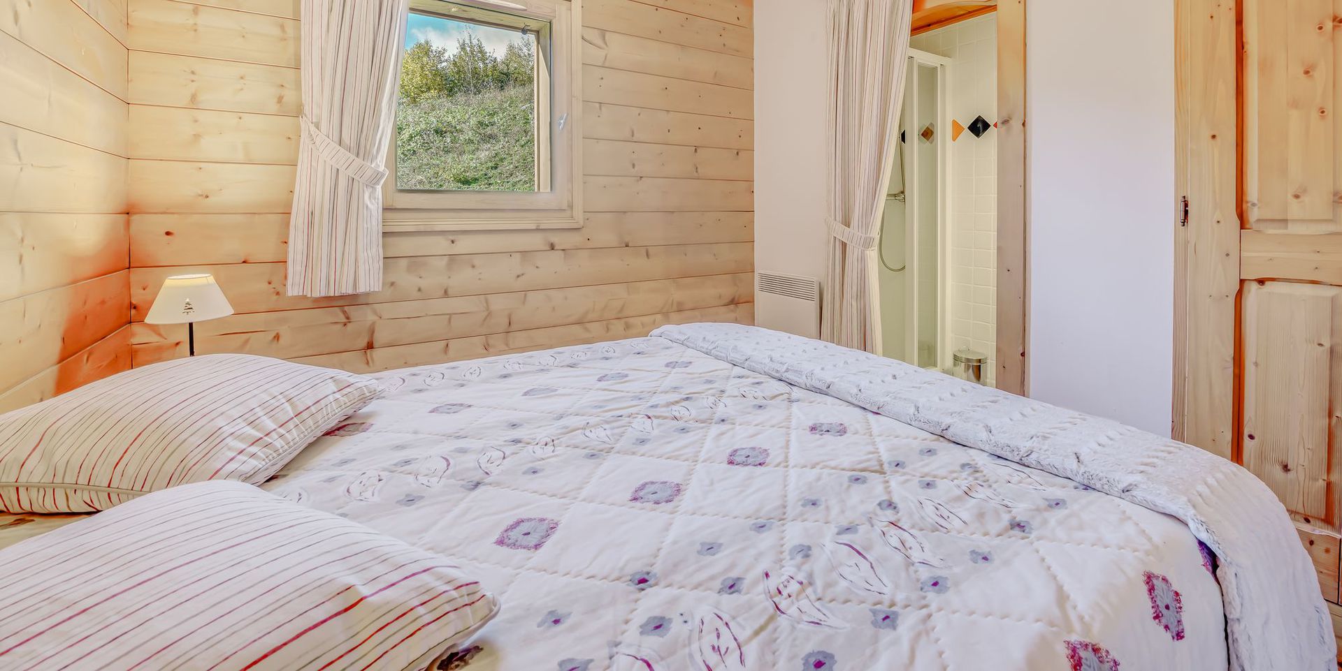 - 1 chambre OUEST avec 1 lit 2 pers. avec couettes, rangements et fenetre + salle d'eau