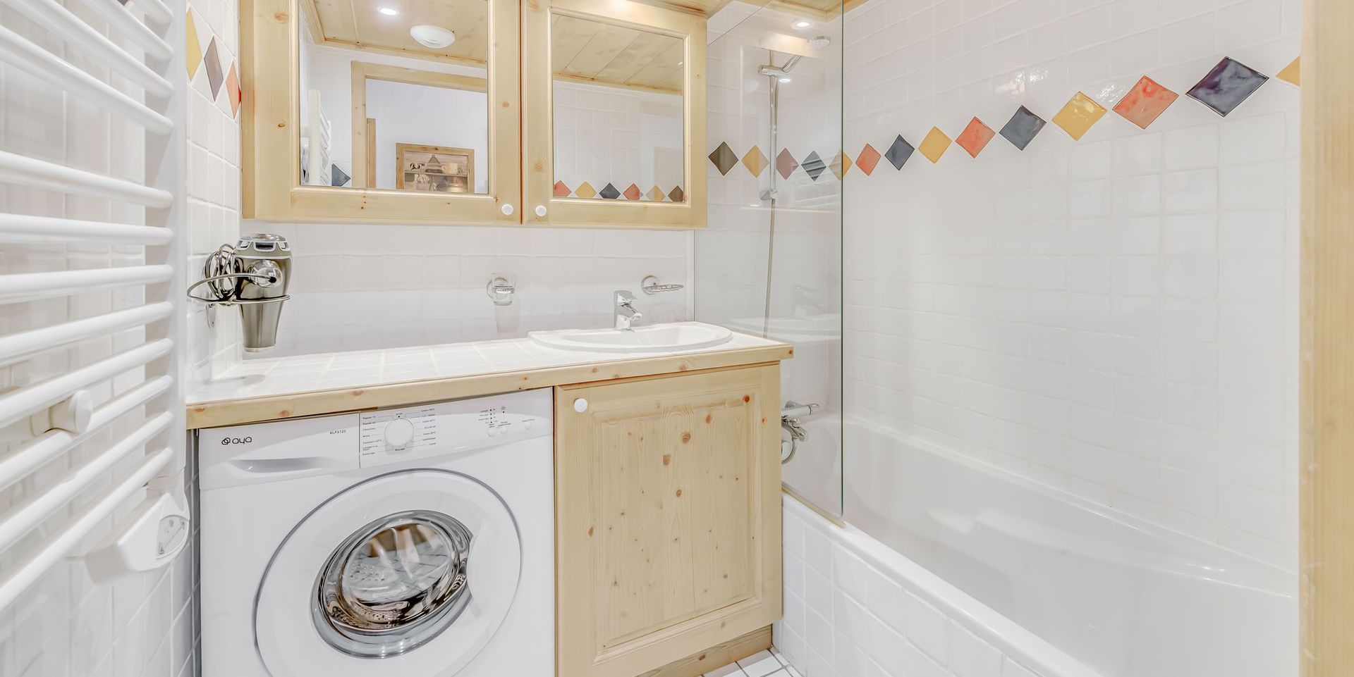 - 1 salle de bains equipee d'un seche cheveux et d'une machine a laver le linge,