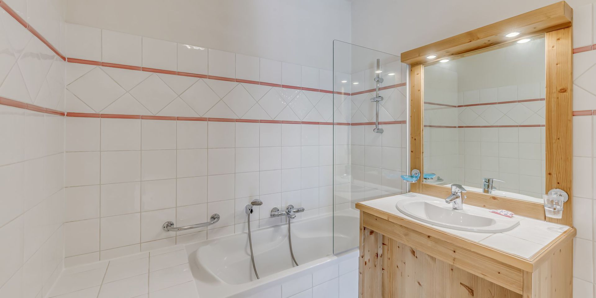 - 1 Salle de bains, avec baignoire, meuble vasque, radiateur sèche serviettes.