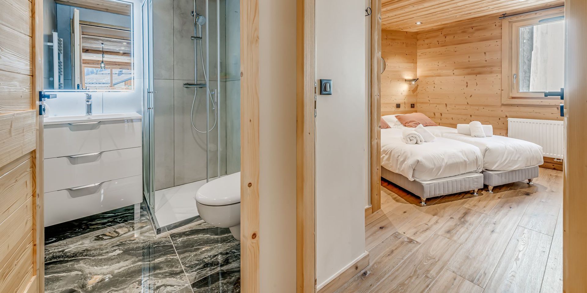 Chambre 1, suite orientee EST avec 2 lits simples (80X200) rapprochables en lit double, placard de rangement, salle de bains avec douche, meuble vasque, radiateur seche-serviettes WC