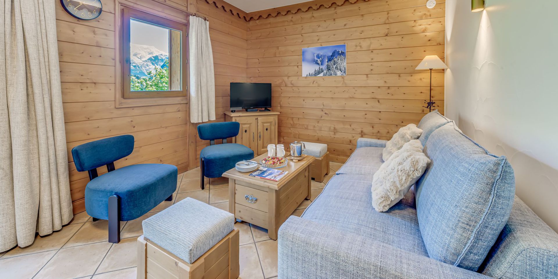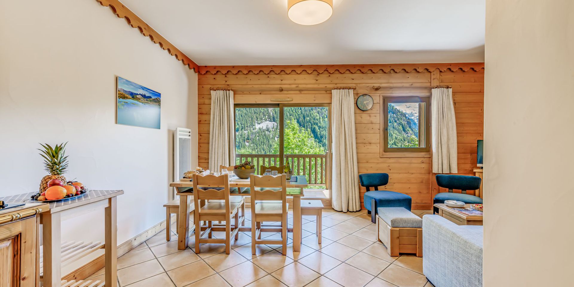 - 1 Sejour - coin repas et coin salon avec 1 canape lit convertible 2 personnes, 2 fauteuils television, porte fenetre sur balcon SUD
