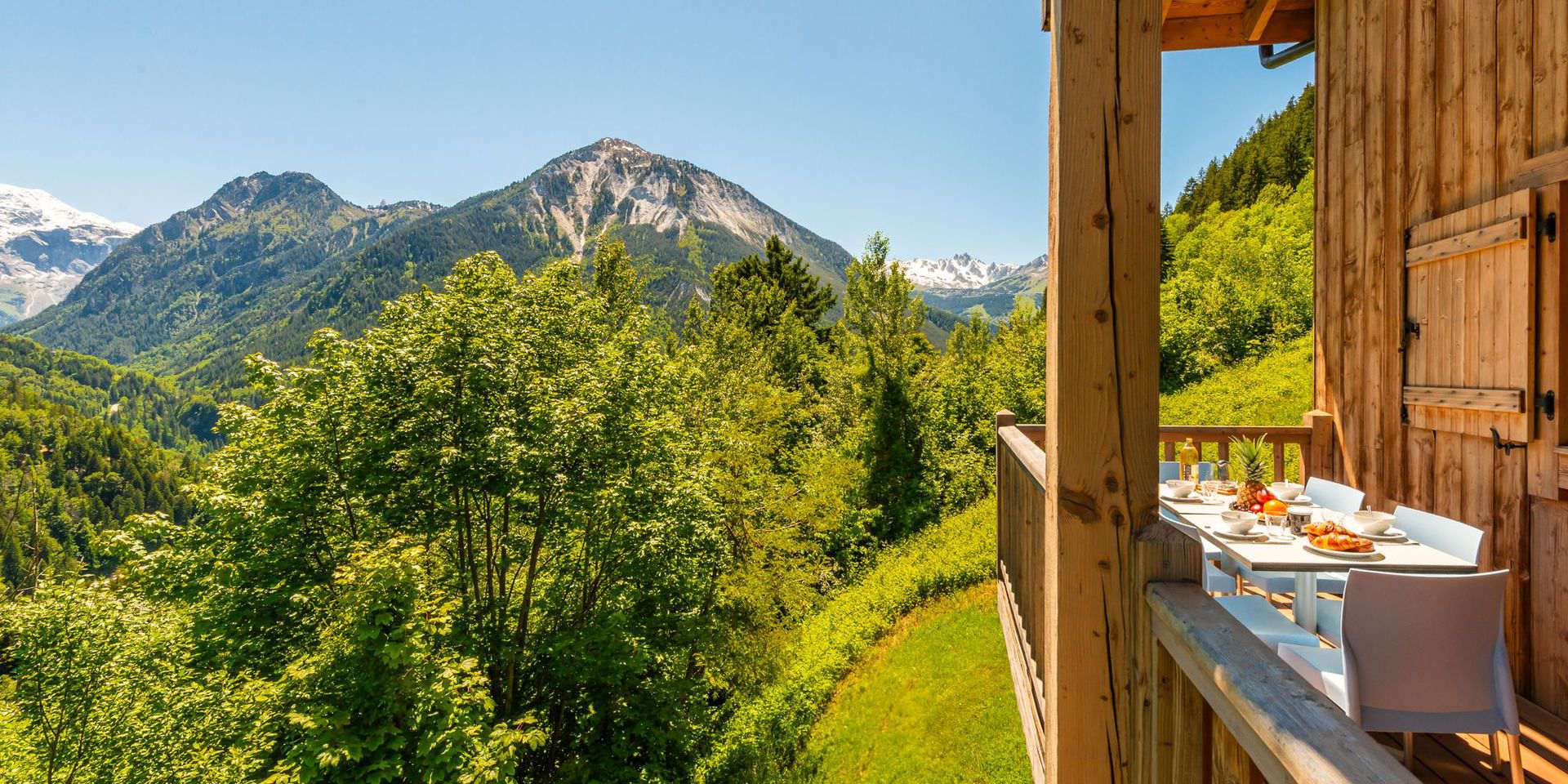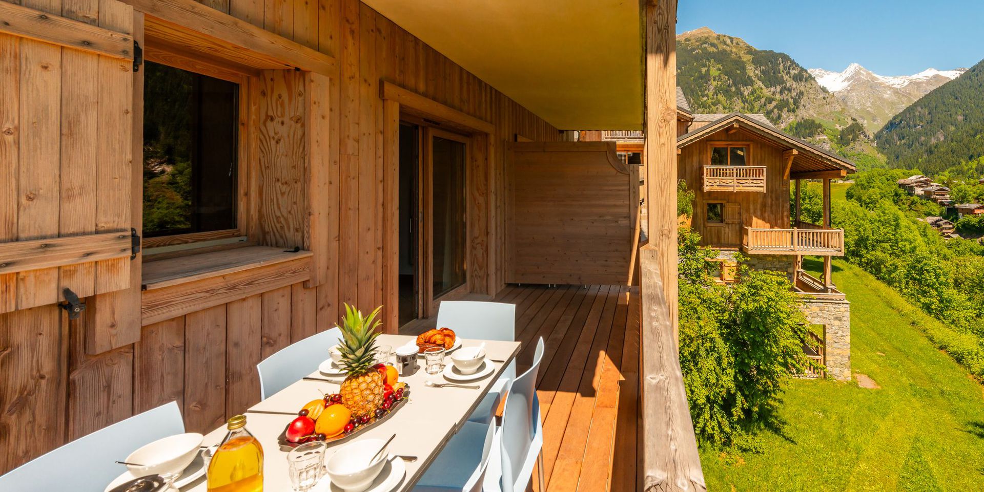 Grand balcon SUD et OUEST avec parquet bois et mobilier de jardin - Vue degagee et sans vis a vis sur la VANOISE et sur COURCHEVEL.