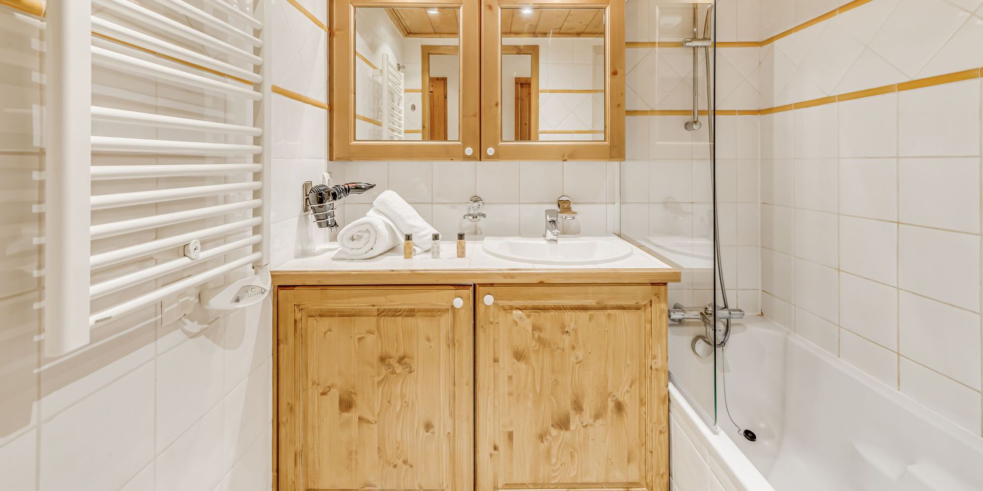 - 1 salle de bain avec baignoire, meuble vasque, radiateur seche serviette, et 1 lave-linge sechant