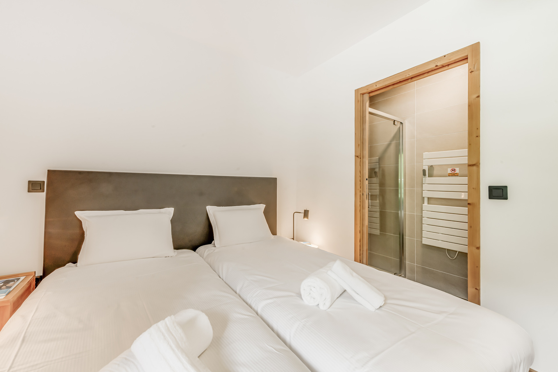 - Chambre 1 - Suite parentale - avec 2 lits simples (90X200) rapprochables en lit double, placards de rangement, petite table de travail, et salle de douche avec meuble vasque et radiateur seche serviettes