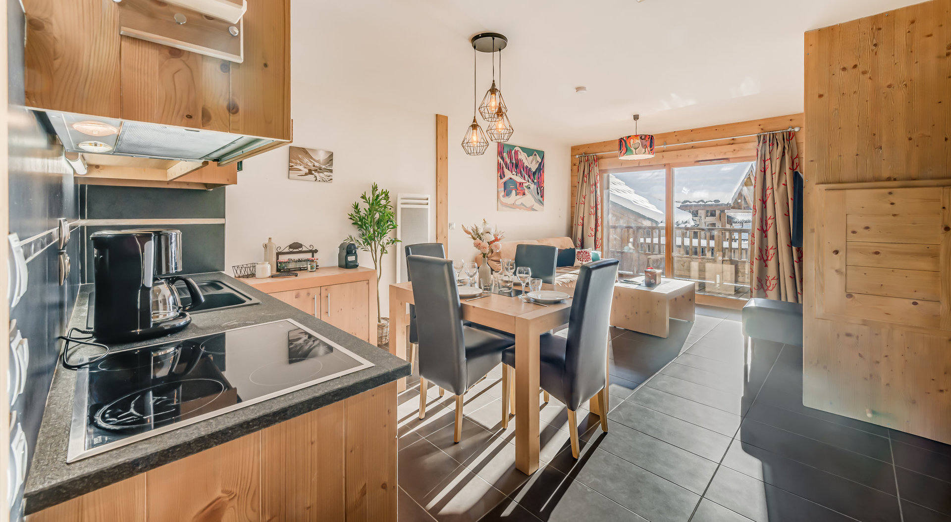 - 1 Cuisine equipee ouverture sur le sejour avec refrigerateur avec partie congelation, four combine, lave vaisselle, plaques vitroceramiques