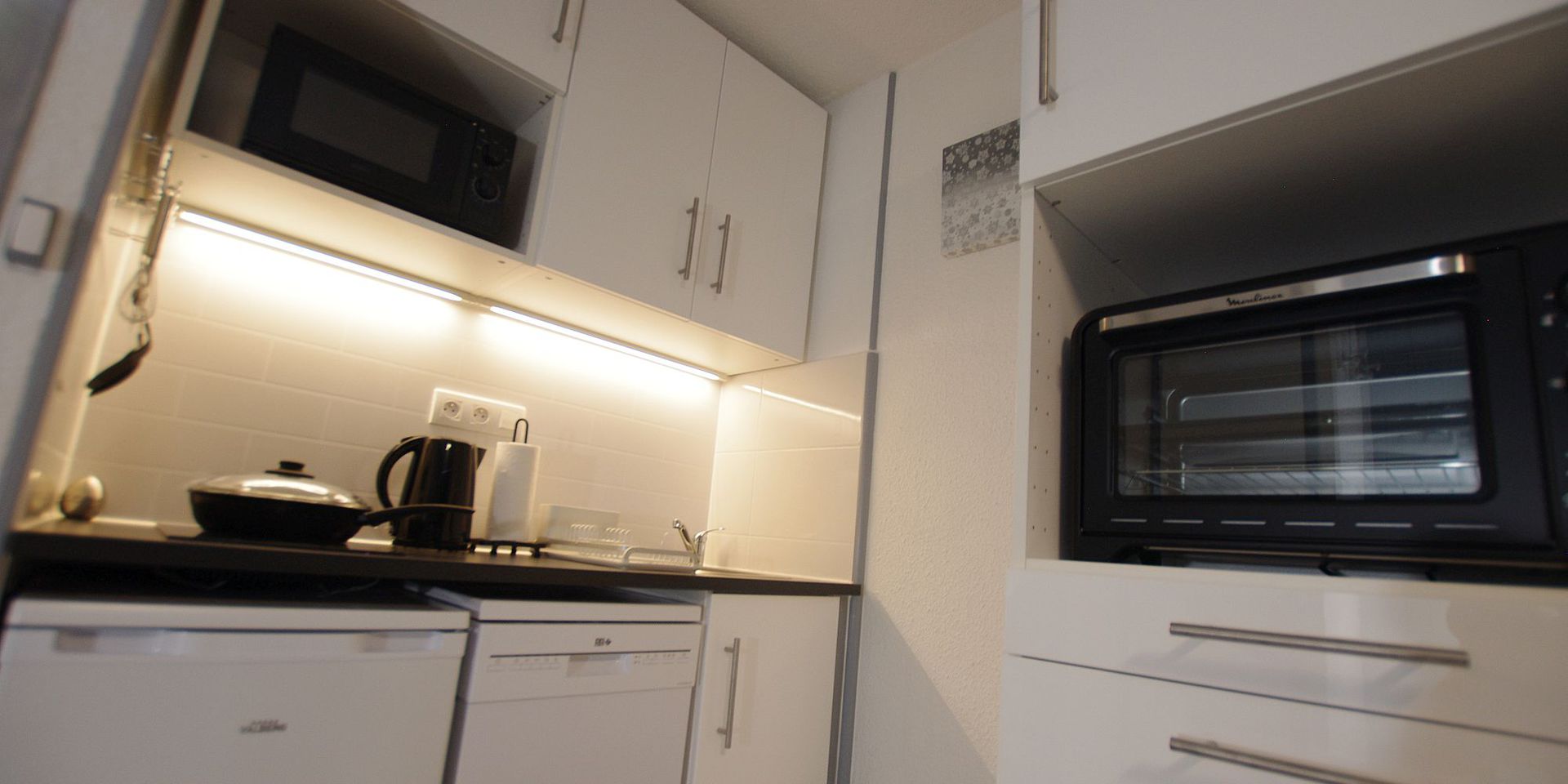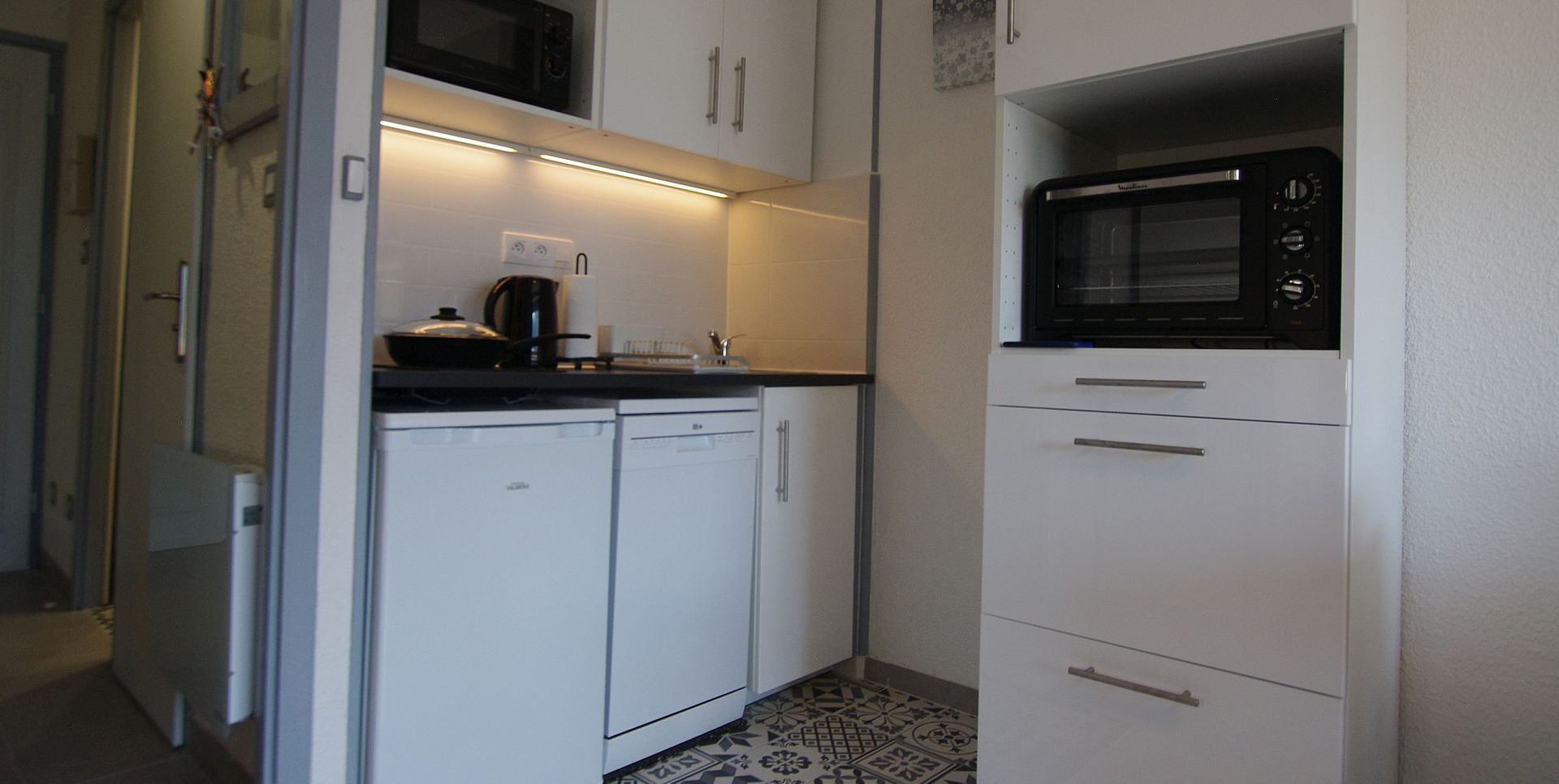 - d'une kitchenette équipée d'un lave-vaisselle, four, micro-ondes, 2 pl. induction, réfrigérateur, cafetière électrique, grille-pain, bouilloire et vaisselle complète.