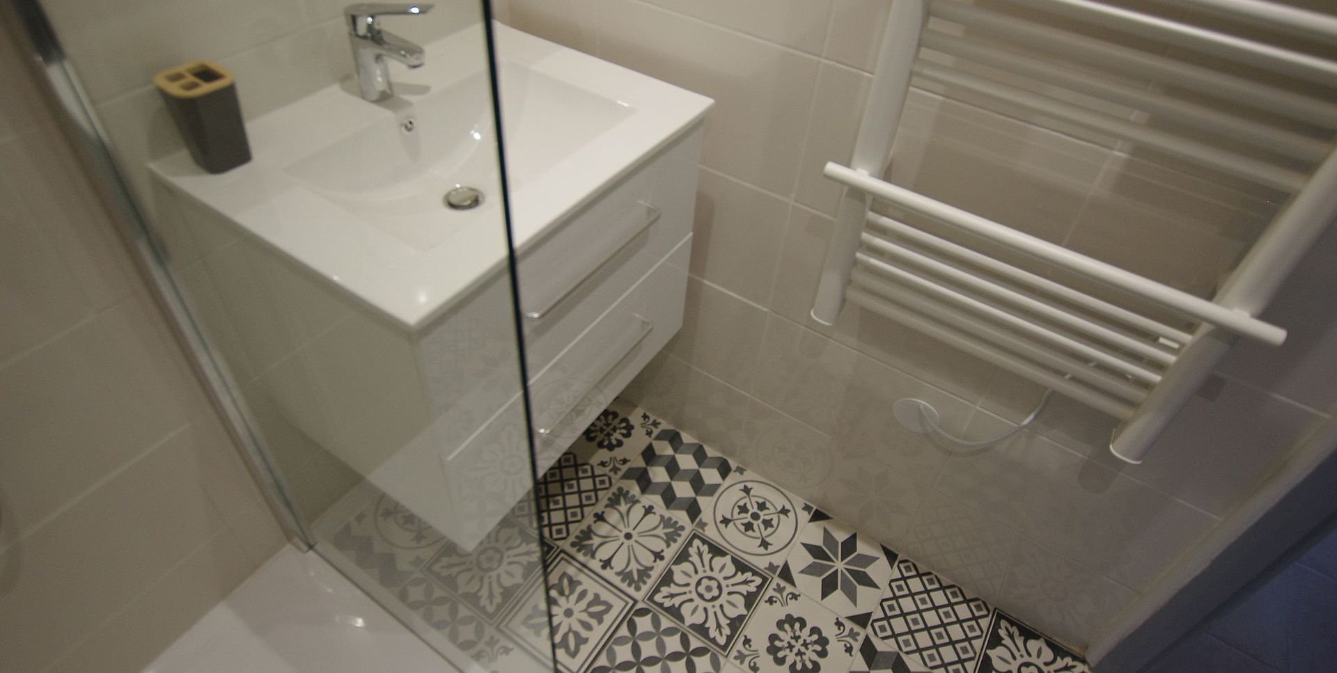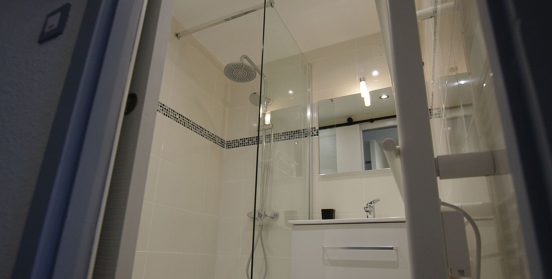 - d'une salle de douche à l'italienne, radiateur séche-serviettes
