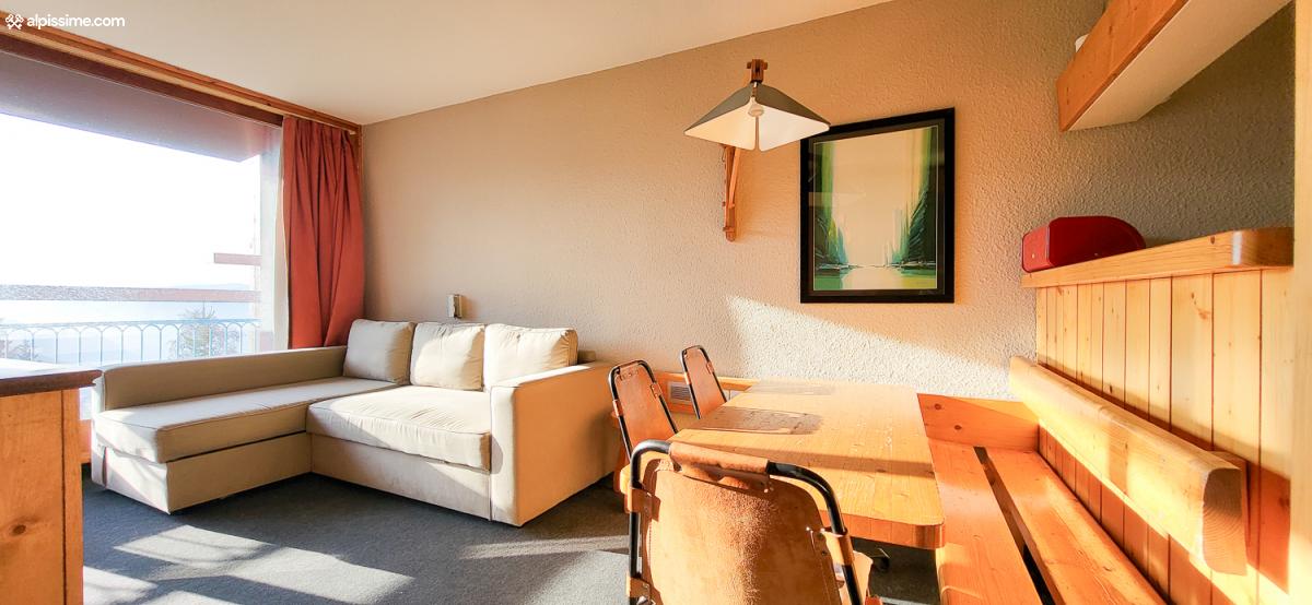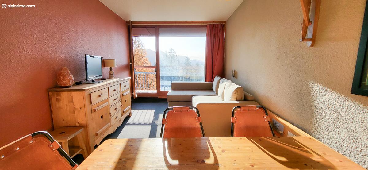 - Une pièce de vie lumineuse avec cuisine ouverte sur un salon accueillant un canapé-lit conversible; Le salon donne sur un balcon avec vue sur toute la Tarentaise.