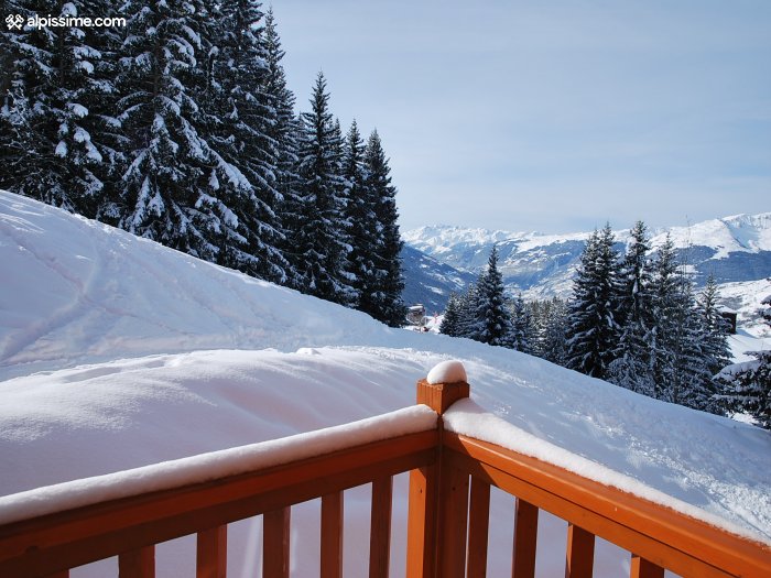 Balcon terrasse spacieux double orientation Est/ Sud Ouest avec une belle vue sur la Tarentaise, avec un portillon accès piste, bien pratique