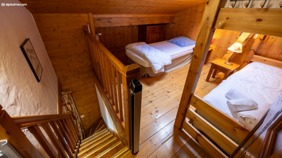- En sortie d'escaliers, une chambre accueillant un lit simple ainsi que 2 lits superposés