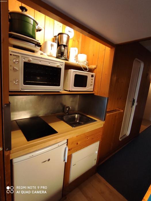 Coin cuisine : plaques de cuisson, mini-four, frigo top, lave-vaisselle, bouilloire, cafetière, appareil à raclette/fondue… Coin séjour : - le canapé clic-clac, TV écran plat de 60cm, balcon vue Mont Blanc - table avec rallonges 4 chaises + tabouret