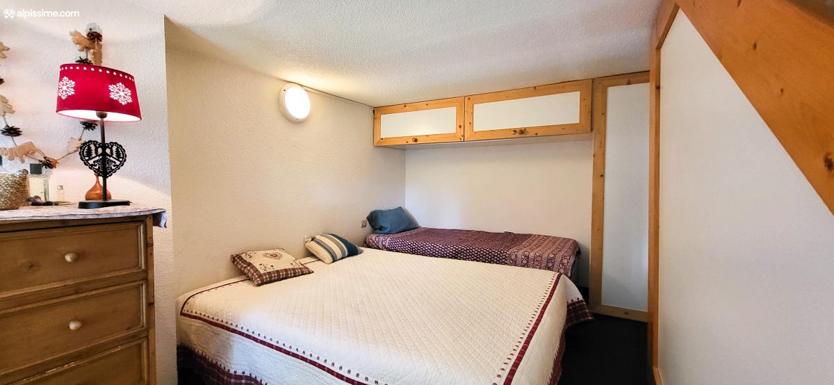 - A l'étage, une chambre en mezzanine profitant également de la luminosité de l'appartement, proposant de nombreux rangements, un lit double et un lit simple