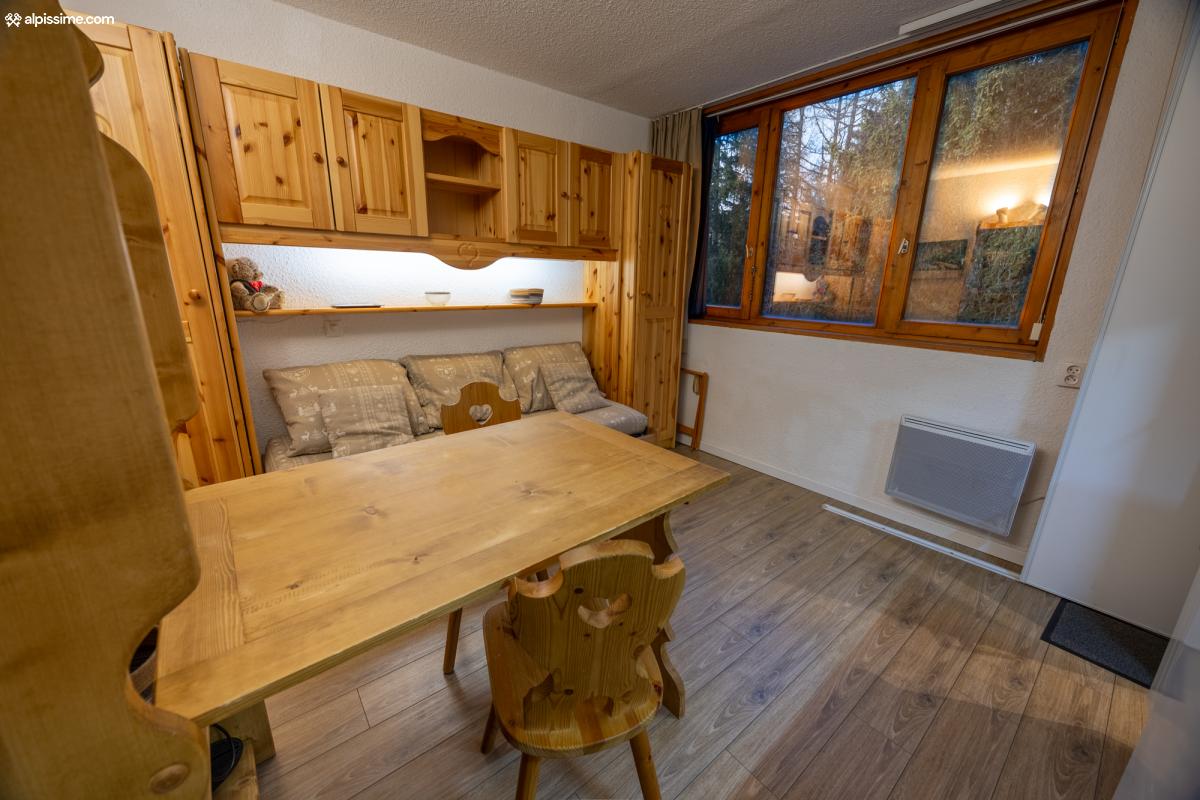 La studette se compose d'une pièce de vie accueillant un canapé-lit gigogne, une salle d'eau, des WC séparés, et un placard ingénieusement aménagé permettant de ranger skis et bâtons facilement et sans risques.