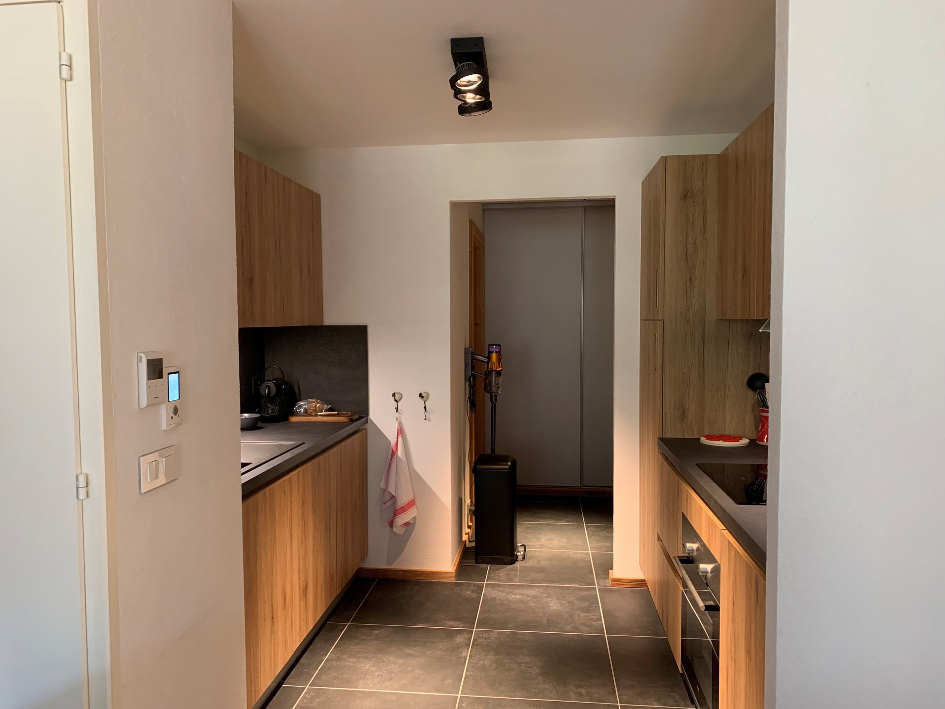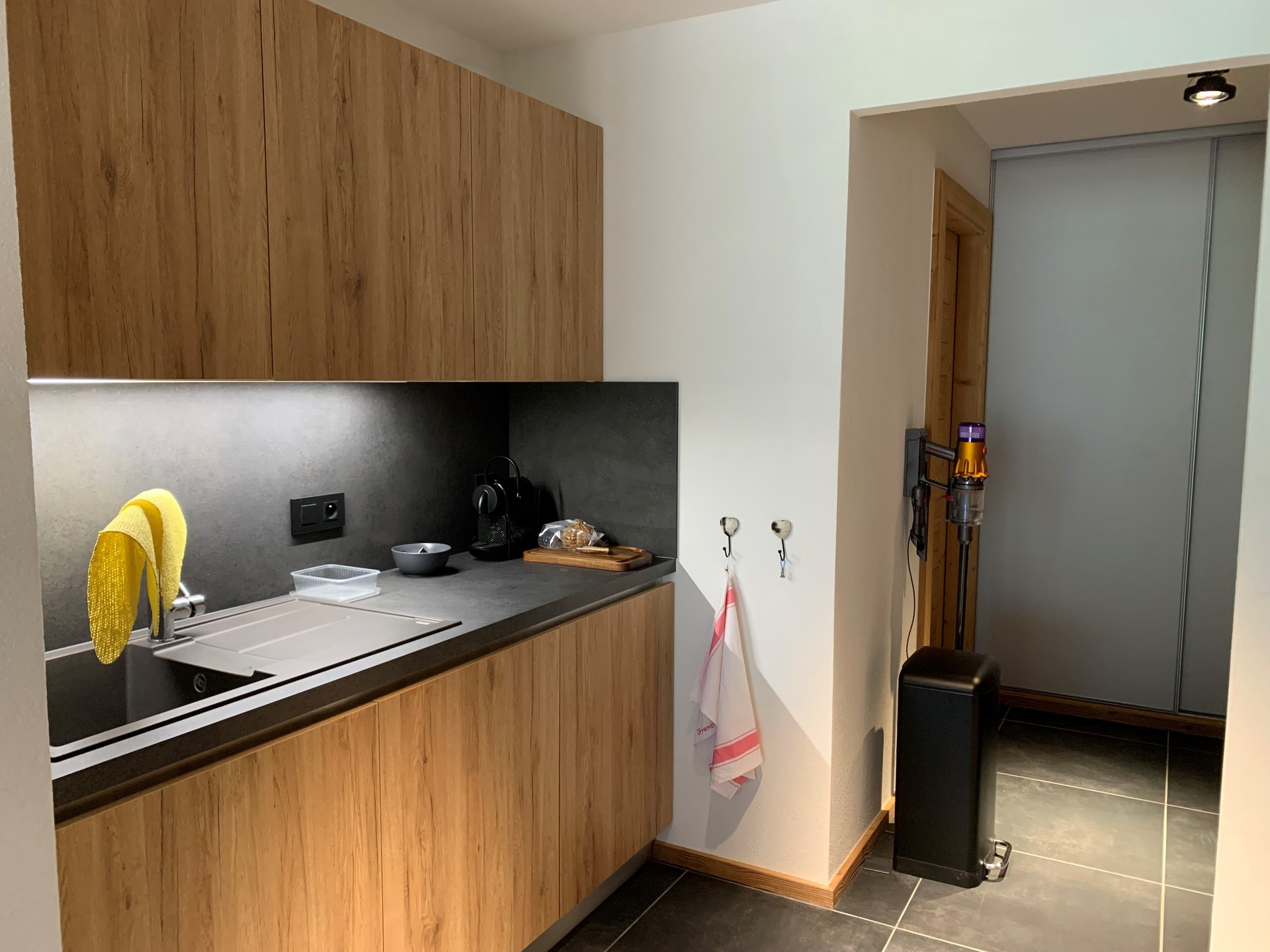 La cuisine est toute equipee contenant une plaque de cuisson, un four, une cafetiere a capsule nespresso, une bouilloire ainsi qu'un appareil a raclette.