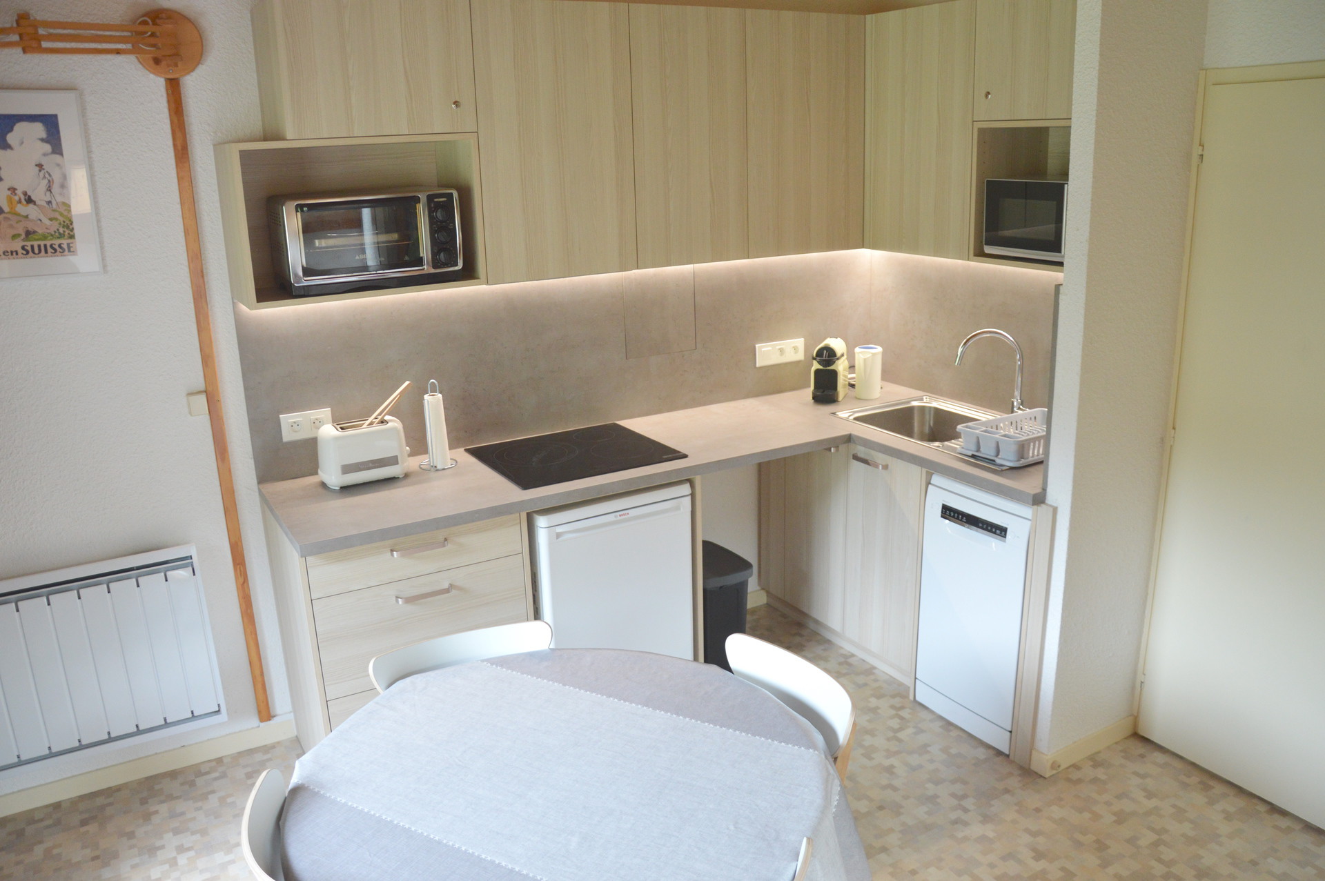 La cuisine est equipee d'une plaque de cuisson a induction, d'un micro-ondes, d'un mini-four, d'une cafetiere Nespresso, d'une bouilloire, d'un grille-pain, et d'un lave-vaisselle, d'un appareil a raclette ainsi qu'un appareil a fondue .