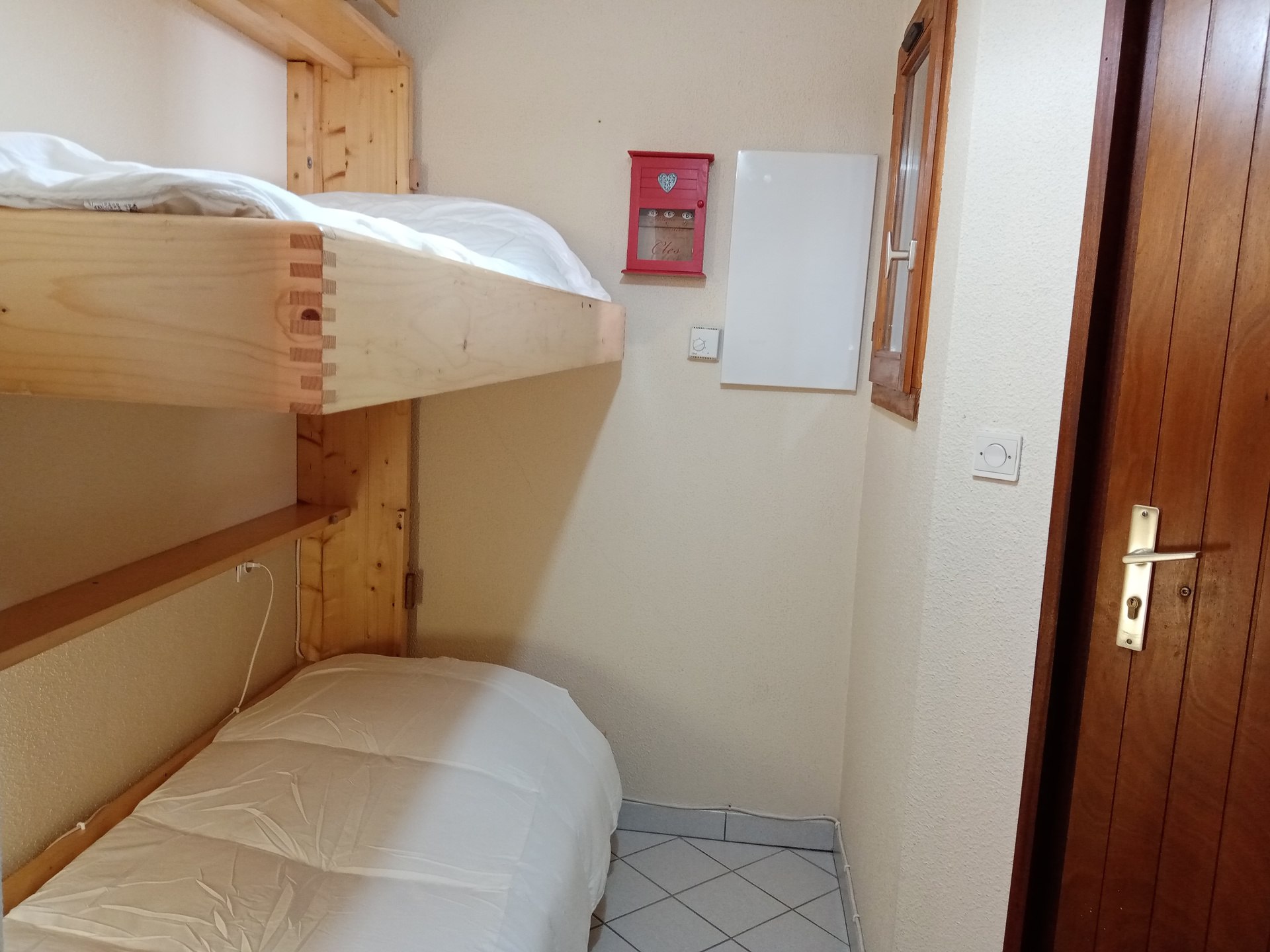 Entree degagee avec placards, un coin montagne avec 2 lits superposes mesurant 80x190, dans la chambre il y a egalement un canape convertible de 140x190, et d'un pouf lui aussi convertible de 80x190, une salle de bain, un WC separe, un sejour, et une cuisine.