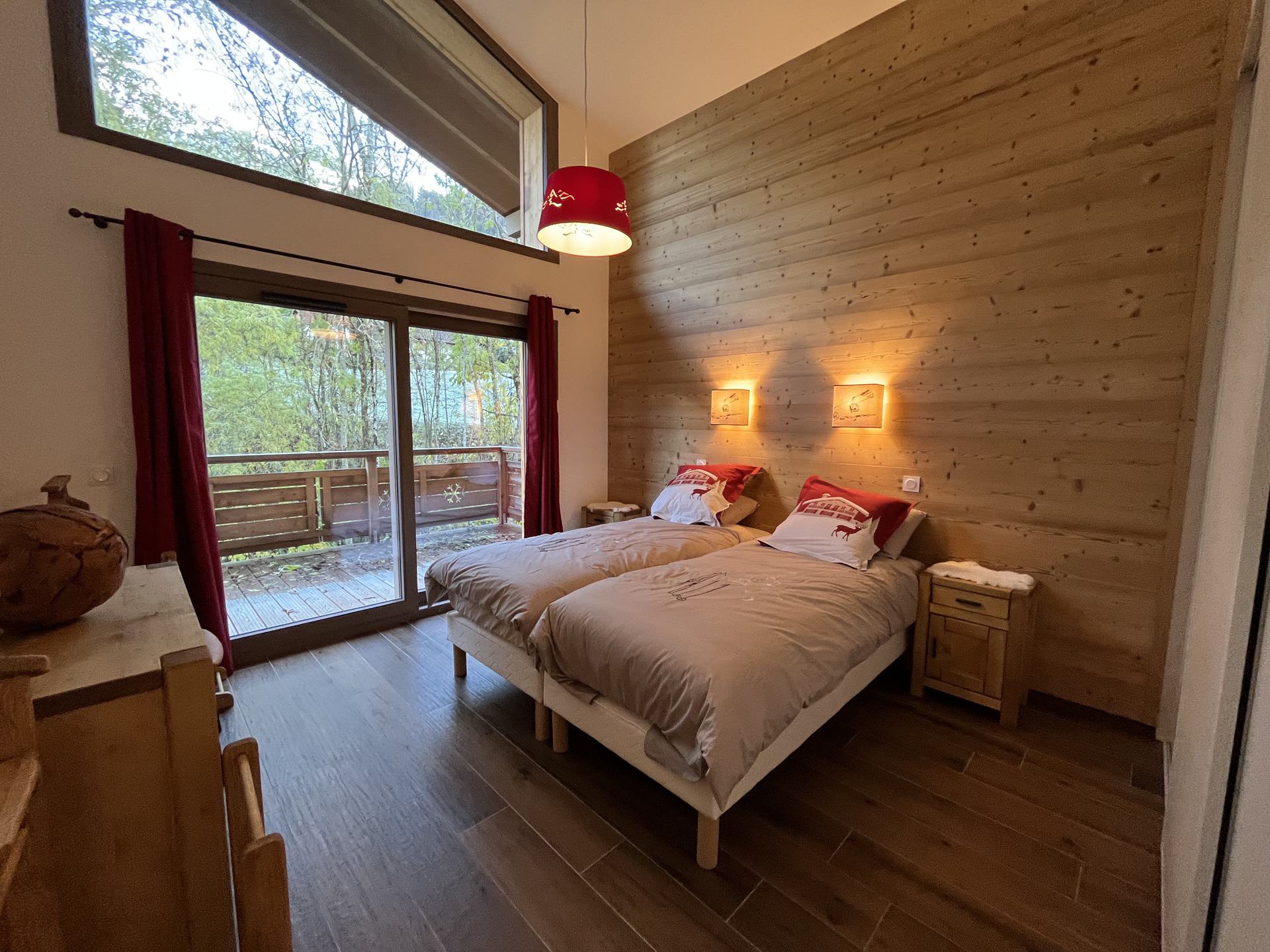 Chambre 1 : 2 lits simples donnant accès à un grand balcon côté nord. Elle possède une salle de bain avec WC privatif.