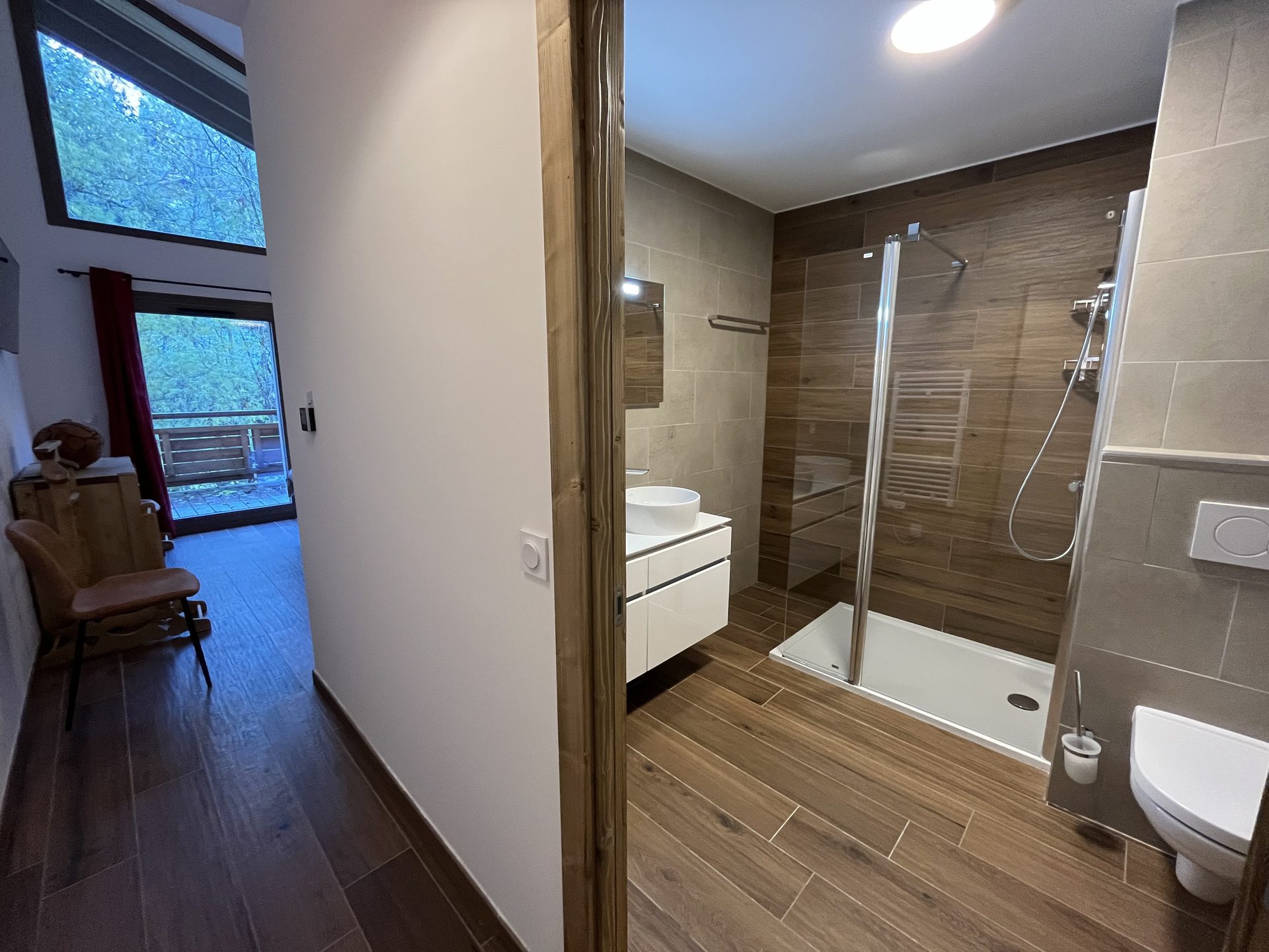 Chambre 2 : 2 Lits simples donnant accès à un grand balcon côté nord également. Elle possède une salle de douche avec WC privatif.