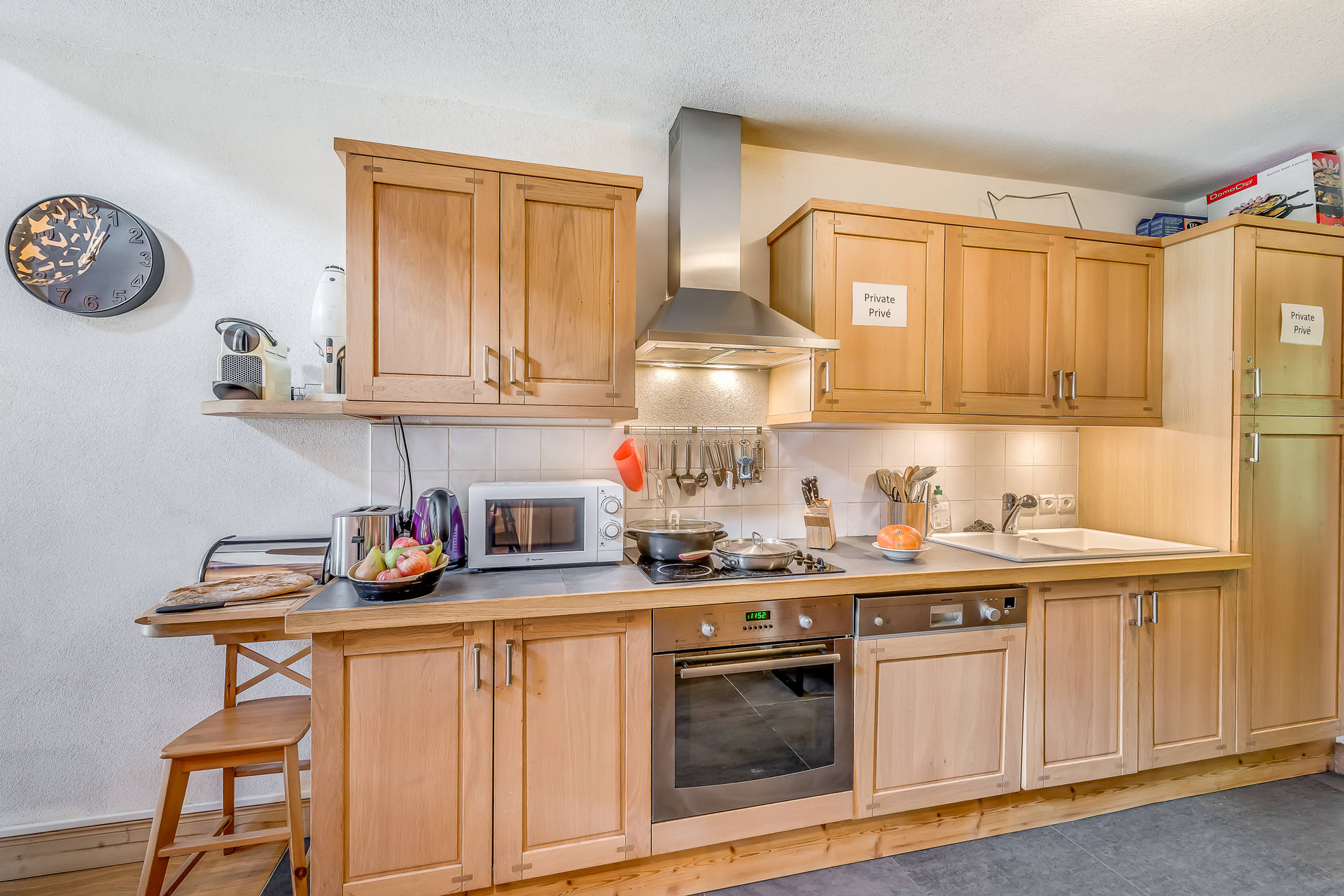 Cuisine ouverte sur séjour-salle à manger, complètement équipée : 1 réfrigérateur, 1 lave-vaisselle, 1 four, 1 four micro-ondes, plaques vitrocéramiques, 1 bouilloire, 1 machine à café Nespresso, 1 grille pain, toute la vaisselle et les ustensiles de cuisine.