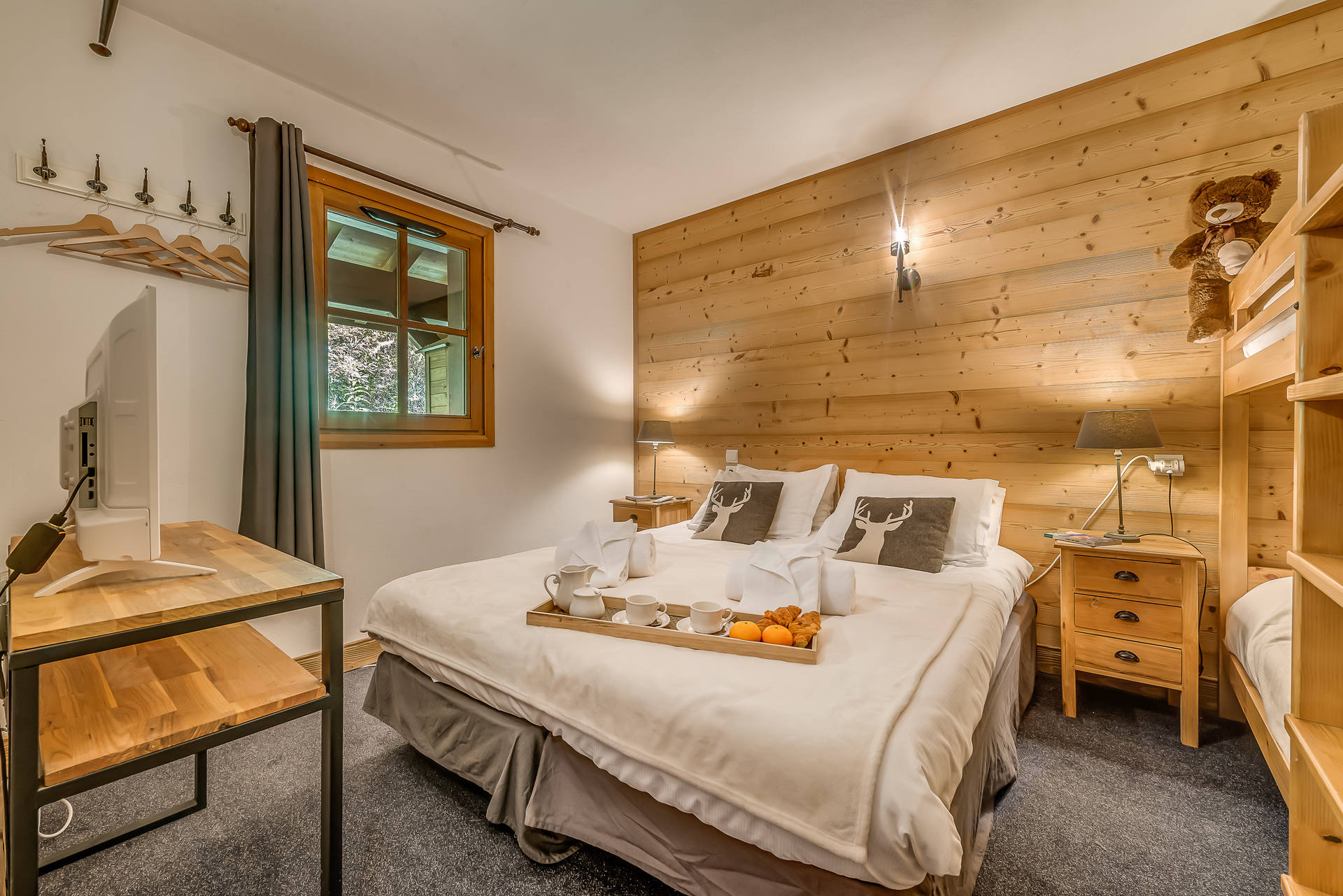Chambre 3 : avec 2 lits simples au sol rapprochables en lit couple, 2 lits mezzanine en partie haute, placard