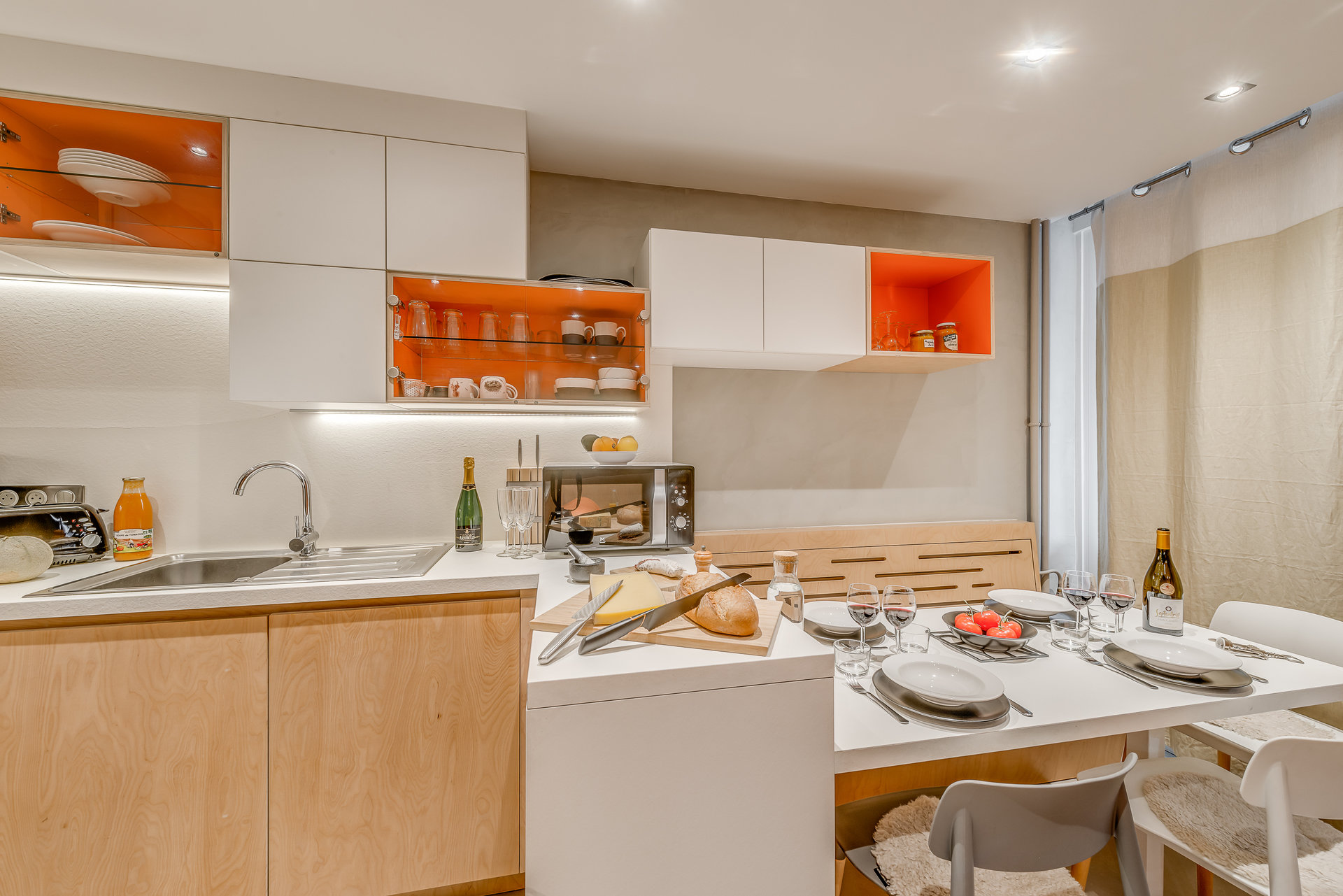 - Cuisine entierement equipee : 3 plaques vitroceramique, refrigerateur, four combine micro-ondes, lave-vaisselle, vaisselle neuve, ustensiles de cuisine, bouilloire, cafetiere et grille pain. Cuisine en liaison avec la table repas.