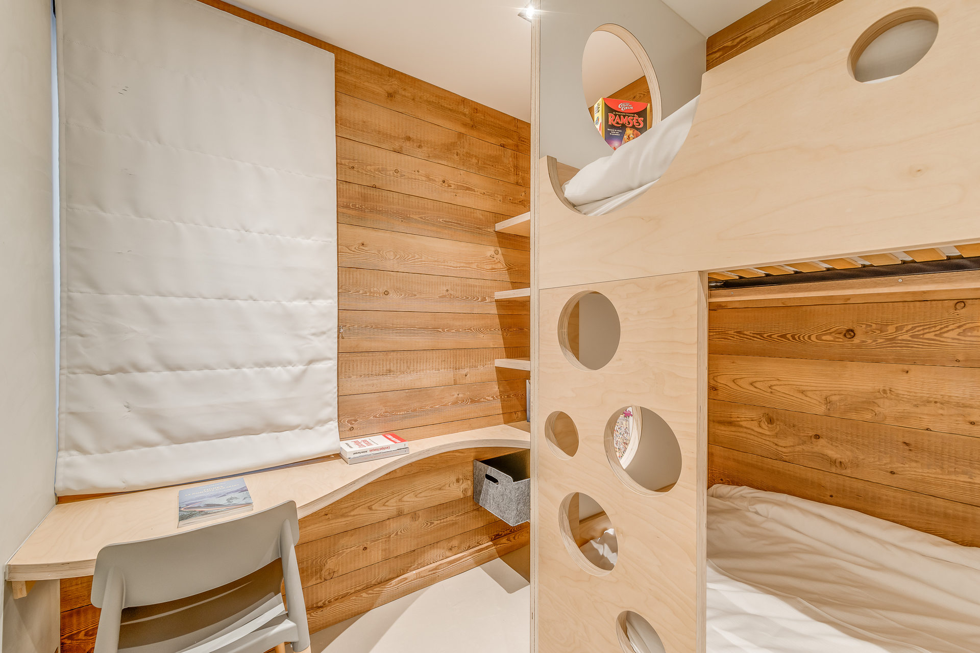 - Chambre cabine : avec 2 lits superposes facon cabane en bois, rangements, petit bureau,