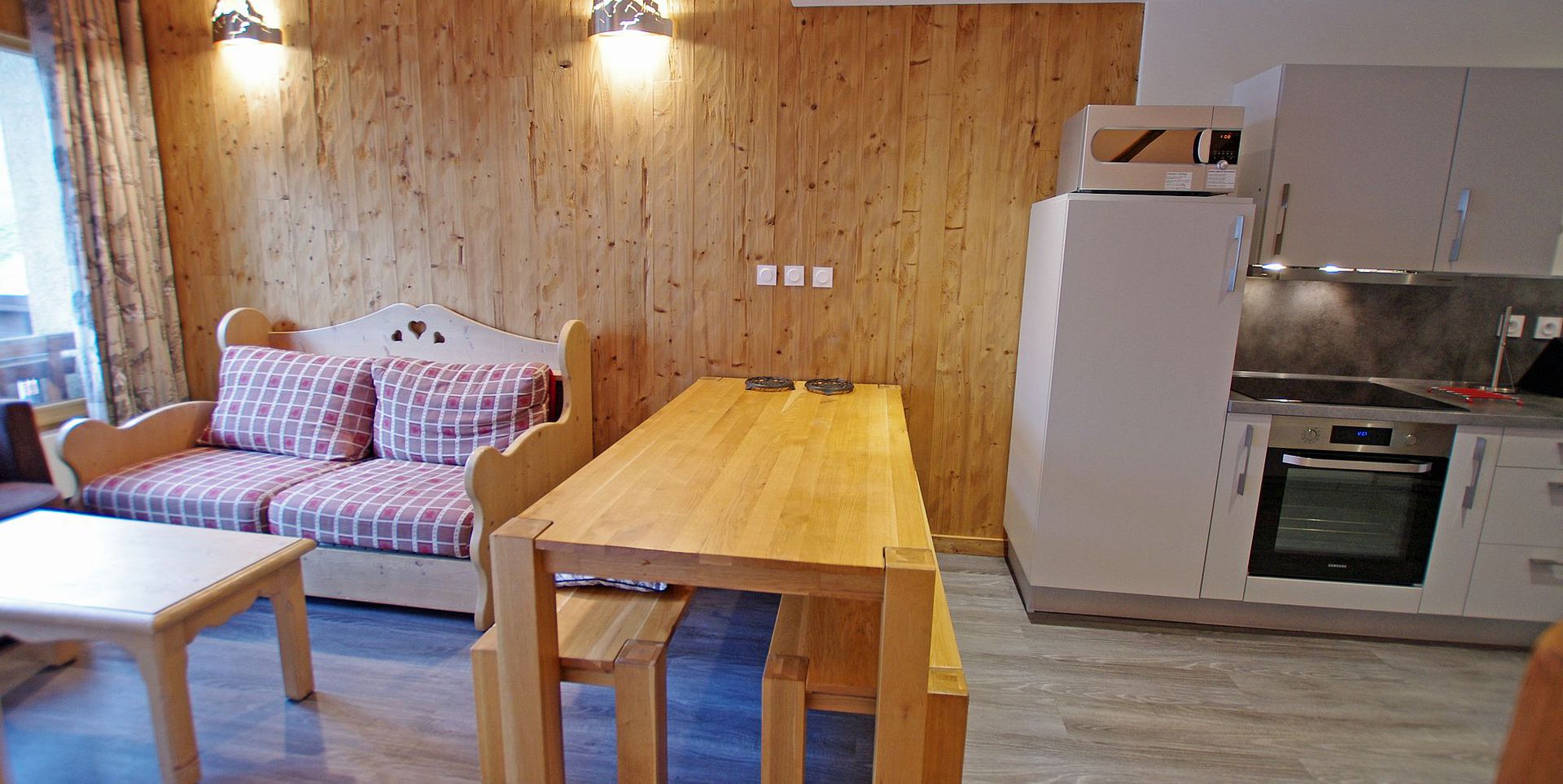 - Cuisine ouverte sur le sejour : Plaques electriques, four, refrigerateur et lave-vaisselle.