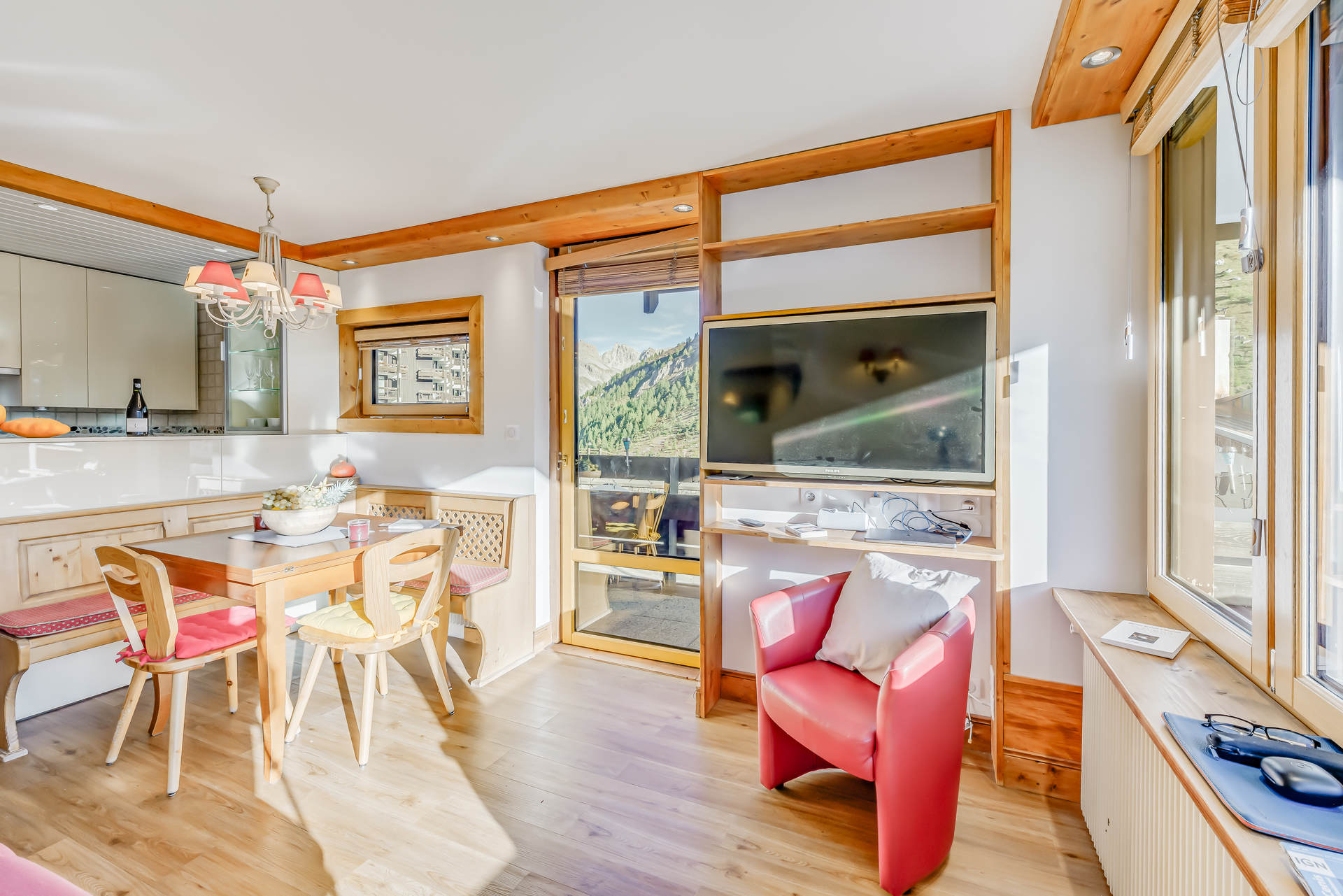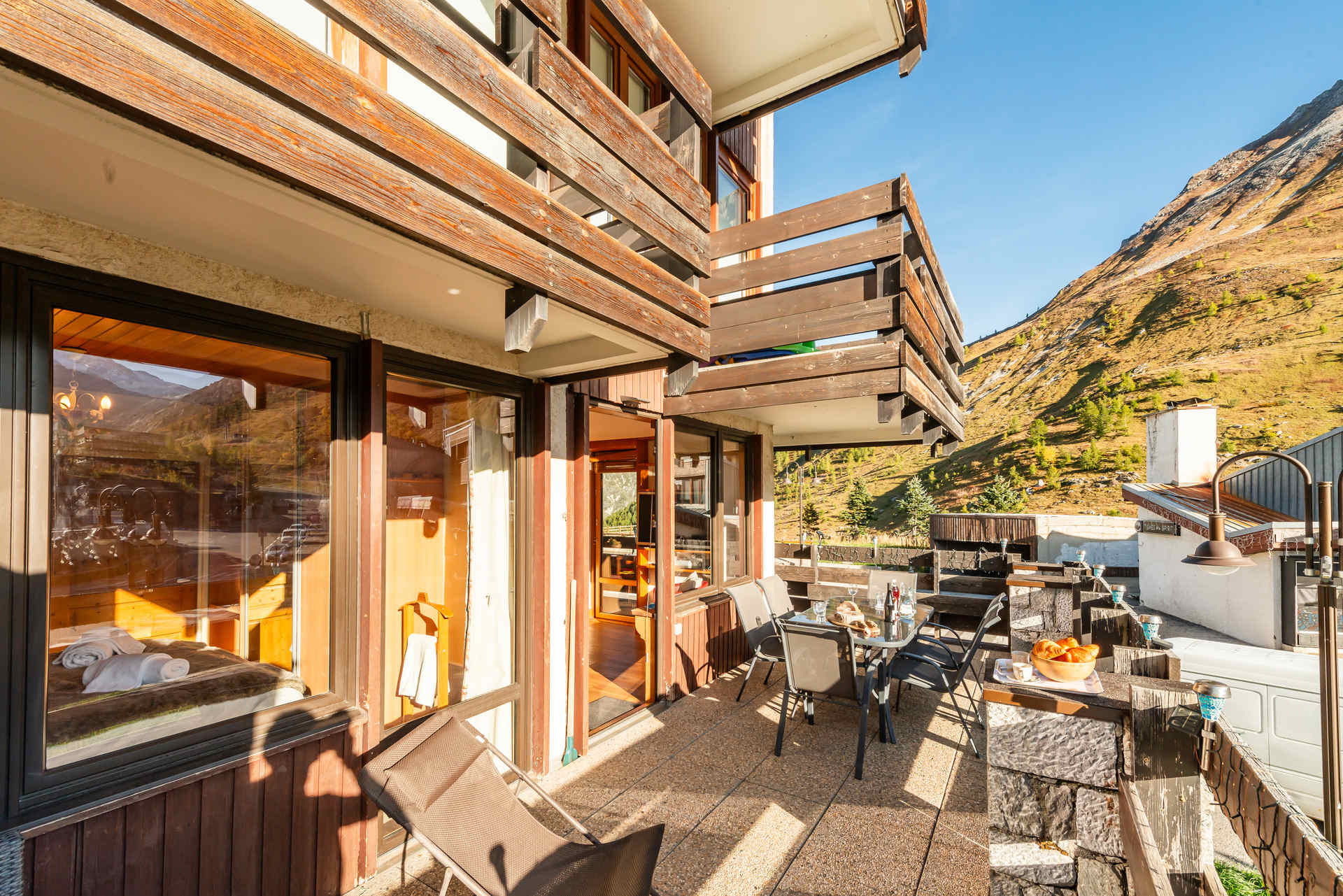 - 1 Grand balcon/terrasse de 30m² en angle EST et SUD avec mobilier d'extérieur et vue sur Tignes et le glacier de la Grande Motte
