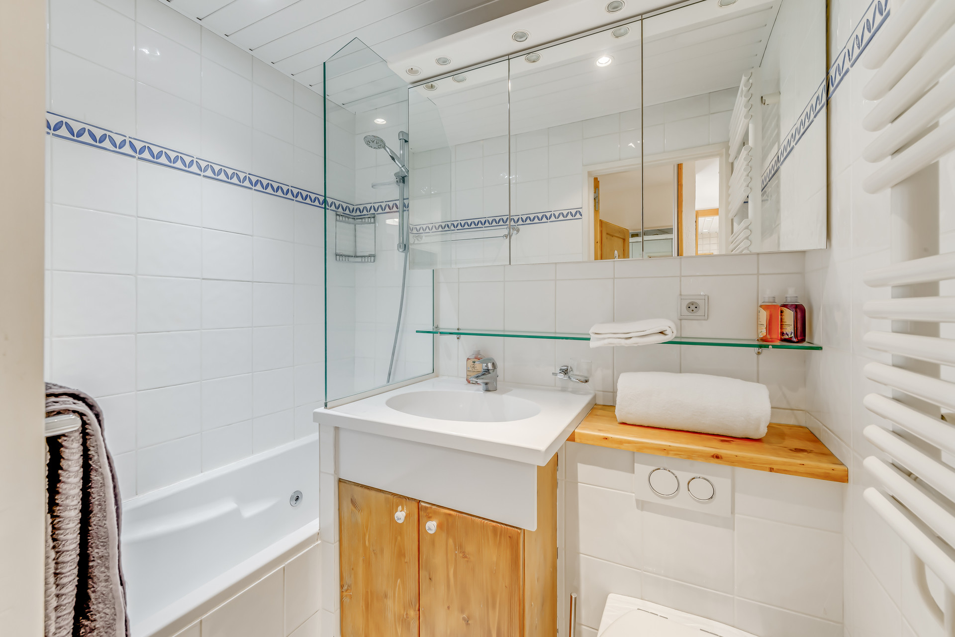 - 1 Salle de bain avec baignoire, meuble vasque, WC et radiateur sèche serviettes