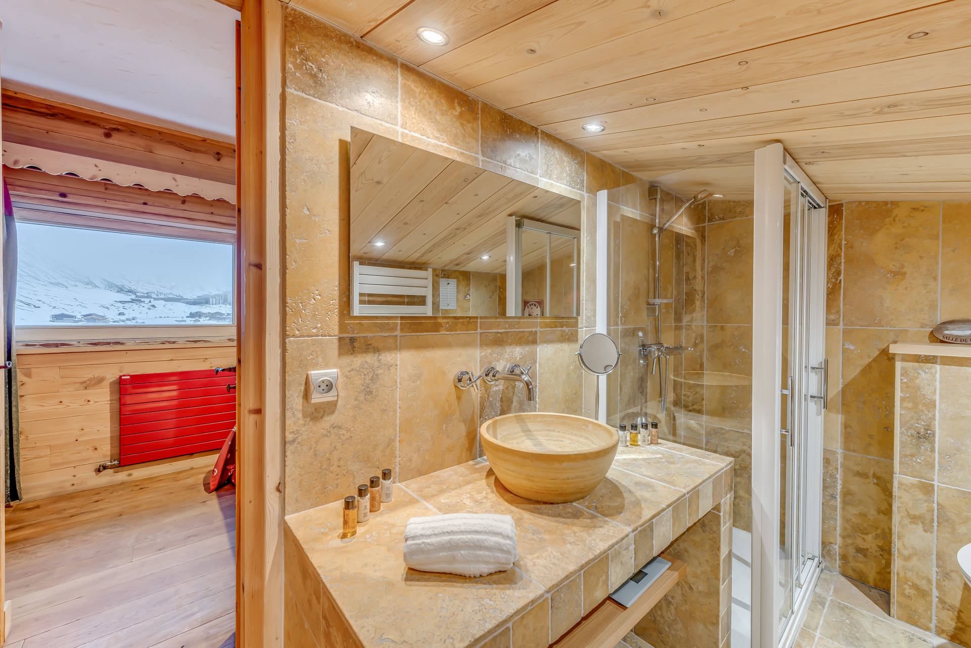 1 salle de bain attenante avec douche, WC, meuble vasque et radiateur seche serviettes