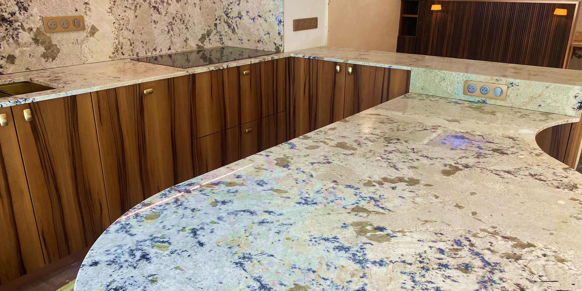 1 cuisine entierement equipee, avec table de cuisson et hotte aspirante integree, four multifonction, refrigerateur avec compartiment congelation, plan de travail en pierre, table de repas en pierre, tabourets et chaises.