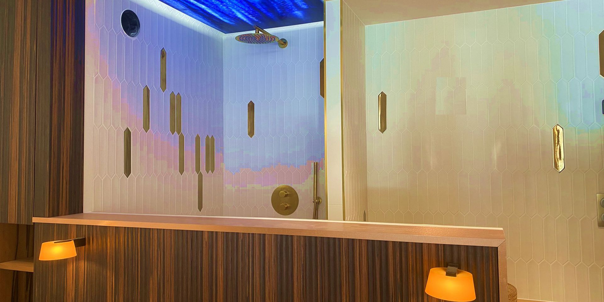 1 Chambre MASTER en SUITE, avec lit-double (lit coffre), placards de rangement, salle de douche, meuble vasque, radiateur seche serviettes. La chambre est totalement vitree en direction du Lac, et beneficie en journee de la lumiere exterieure. Pendant la nuit, la chambre est occultee par des grands rideaux coulissants.