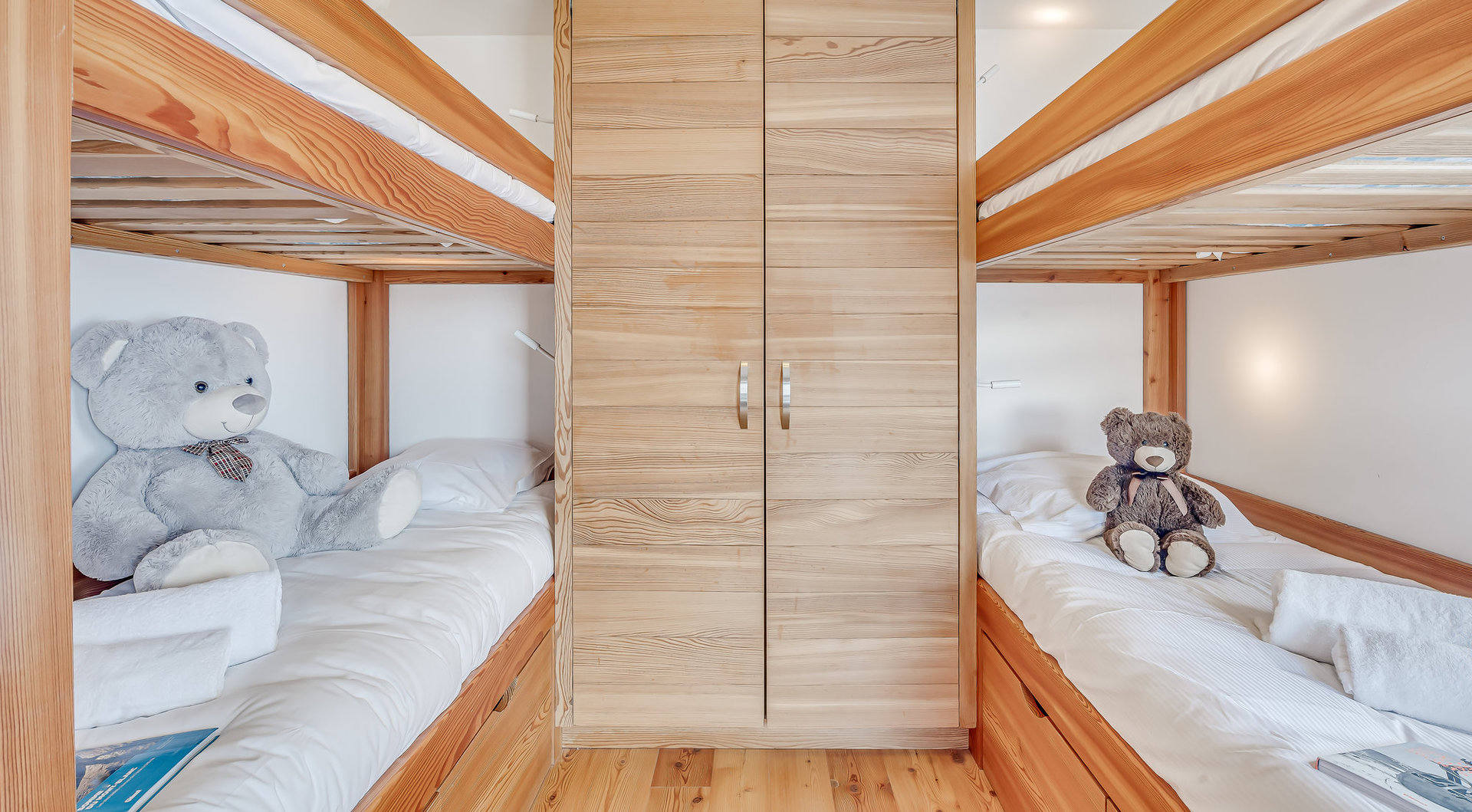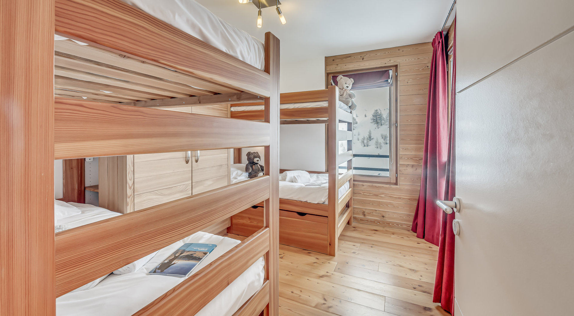 Chambre 1 EST et SUD avec sortie sur Balcon, avec 2 fois 2 lits superposes, placards de rangement