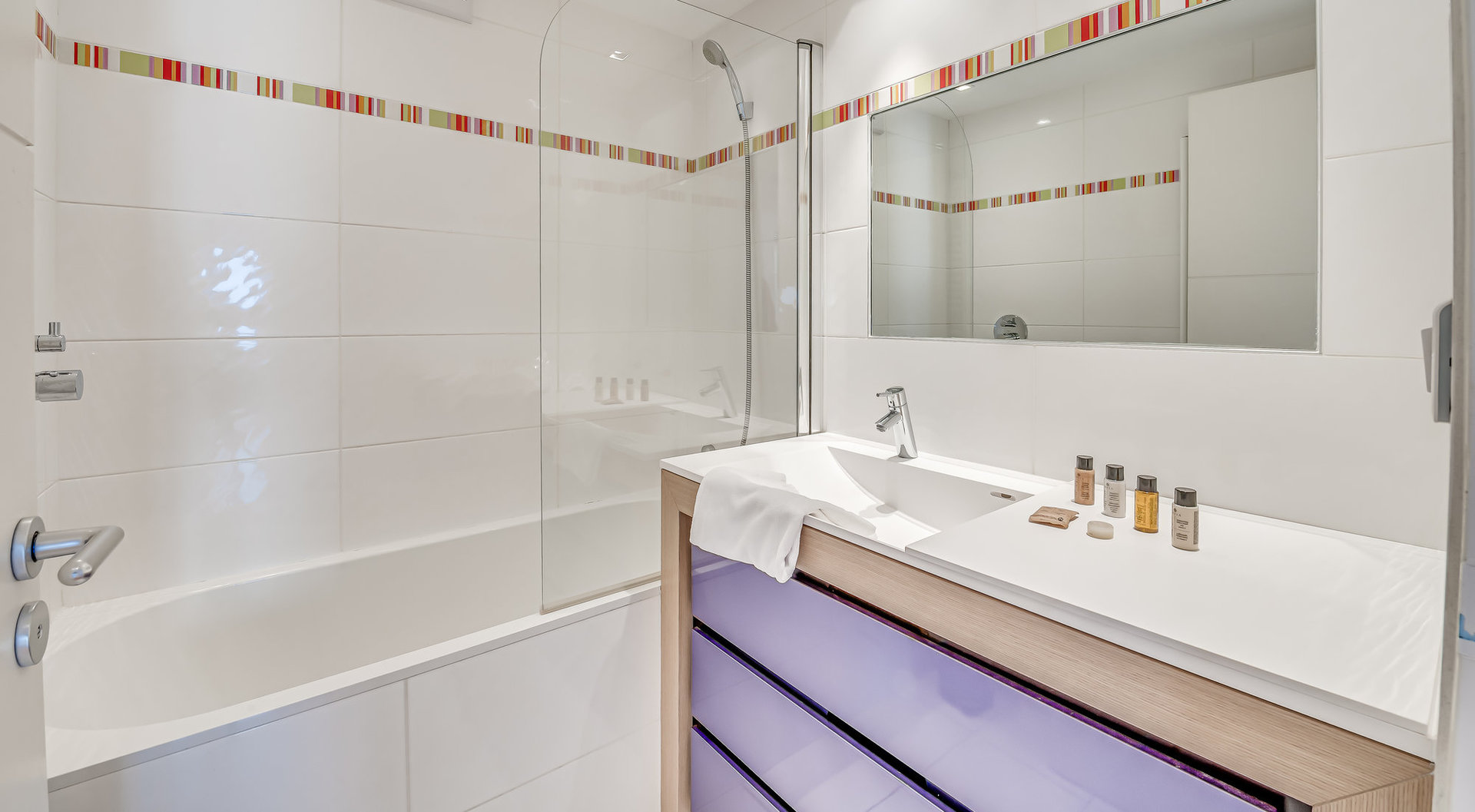Salle de bains avec baignoire, pare-douche en verre, meuble vasques