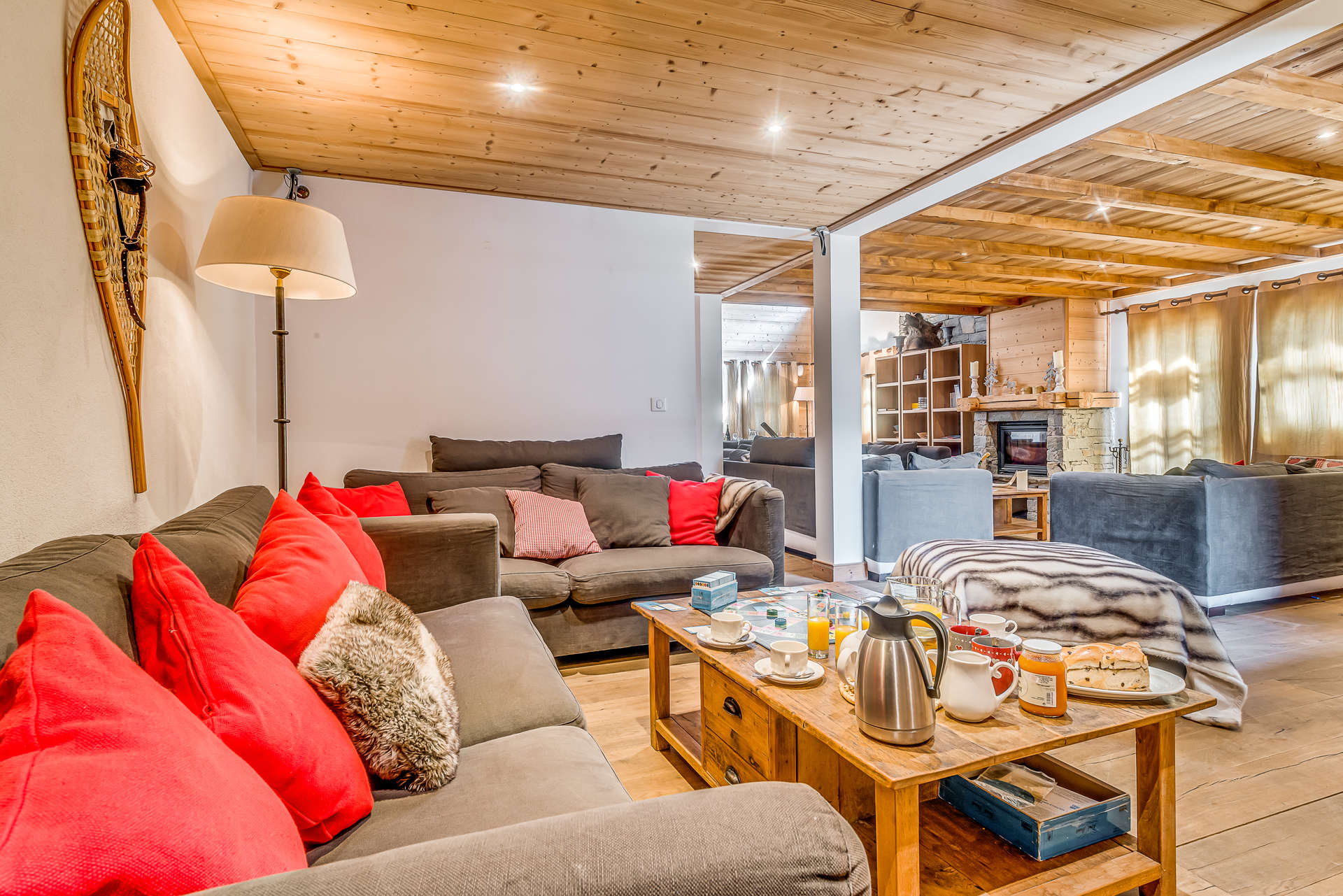 - l'entree dans le chalet WHISTLER se fait par la grande terrasse (deck bois), vous accedez a une petite entree (avec WC) puis au grand sejour avec cheminee la hauteur sous toit de 4 a 5 metres.