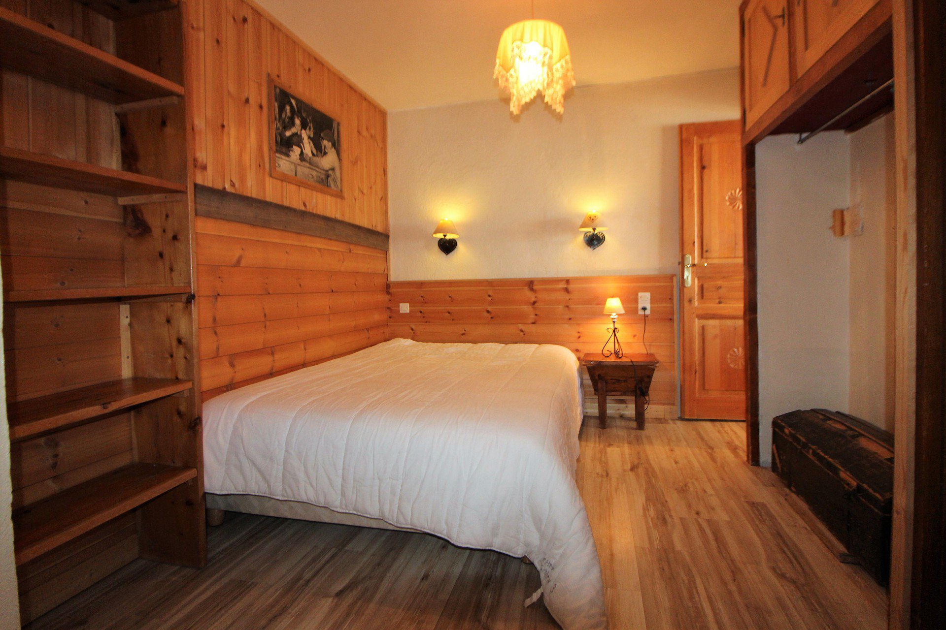 1 grand lit et 1 lit simple, 1 pupitre d'ecolier avec 1 banc, de nombreux rangements.