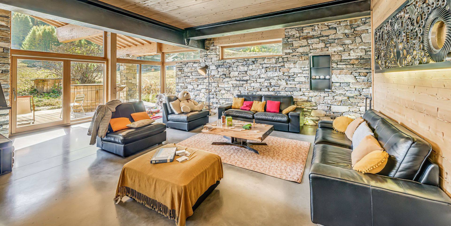 - Salon expose Sud avec ensemble de fauteuils et banquettes, 1 TV, Cheminee 360 degres, grandes baies vitrees, acces a la terrasse exposee SUD