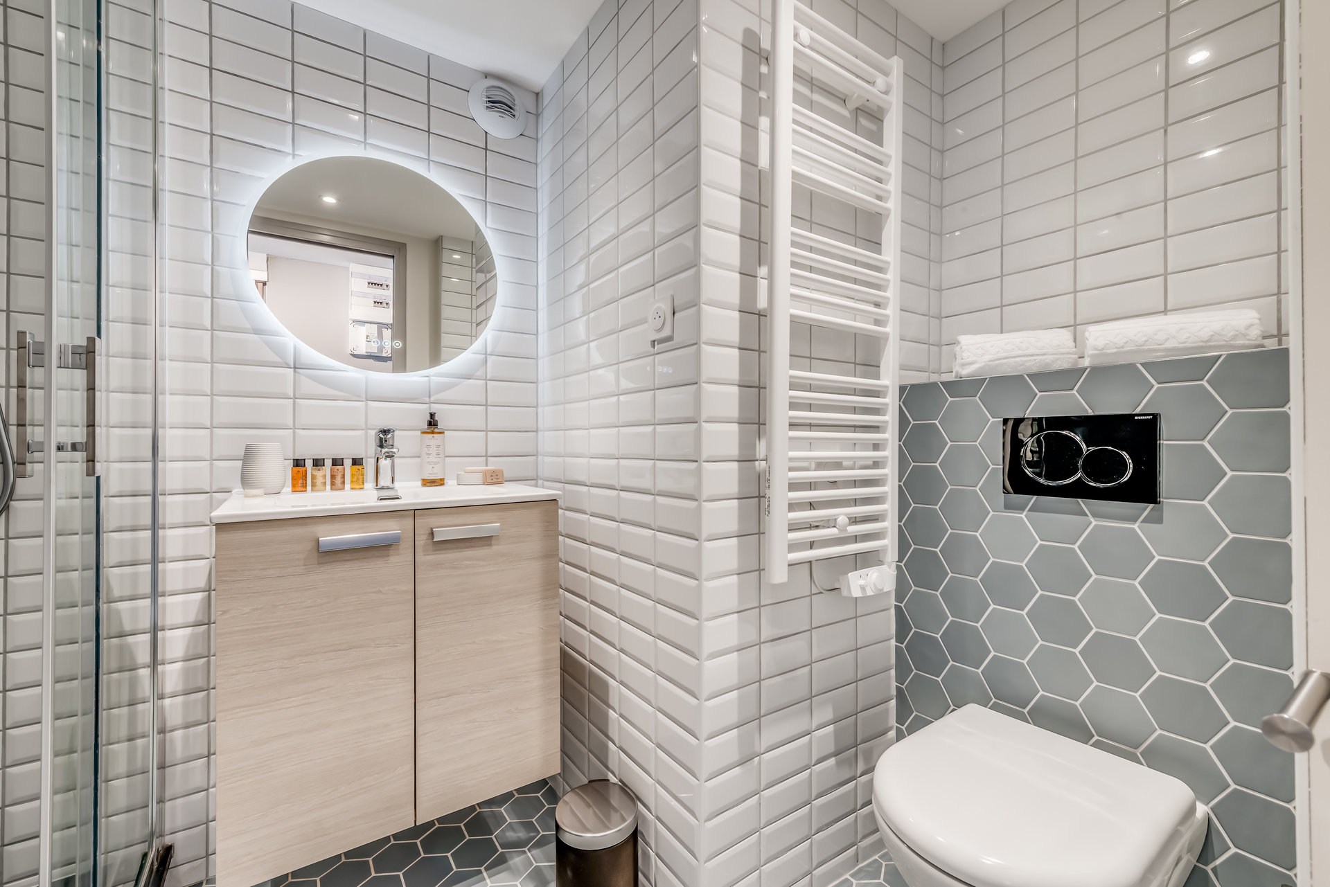 - Salle de bain avec douche, meuble vasque, lave-linge et WC